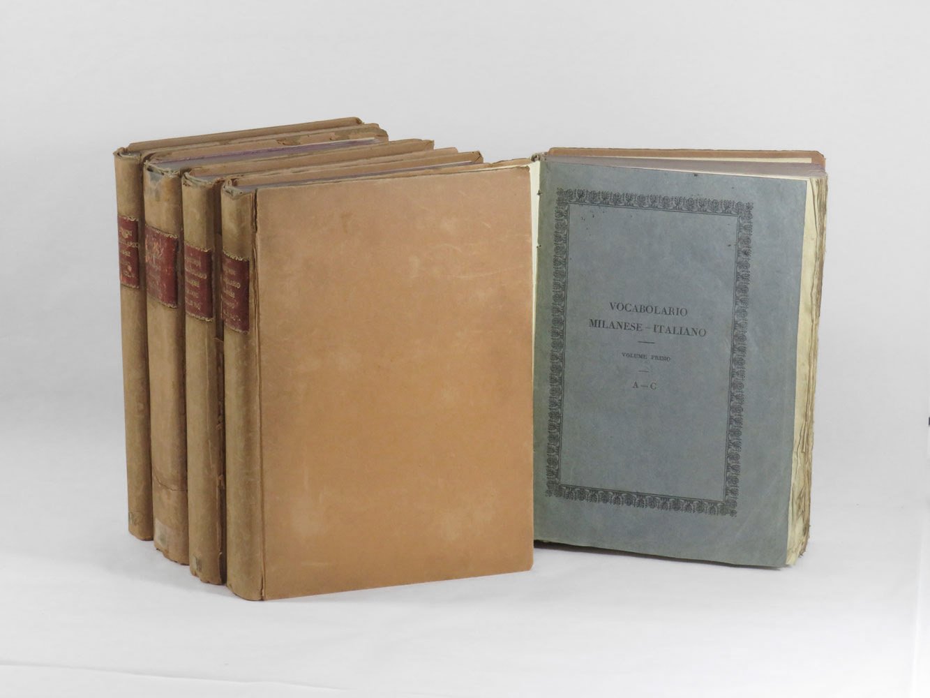 LIBRO Edizione originale, rimane ancora oggi il miglior vocabolario del dialetto milanese mai composto. Cherubini morì durante la sua pubblicazione, che fu portata avanti dapprima da G. Villa e poi terminata da G.B. De Capitani. Dal ’39 al ’41 uscirono i primi tre volumi; si dovette aspettare il ’43 per un voluminoso quarto volume che comprende, con numerazione a sé, l’allegato «Giunte e correzioni», e reca infine la lista degli associati. Il quinto volume vide la luce nel 1856: ospita nelle pagine introduttive i «Cenni biografici intorno all’abate Giuseppe Villa» del De Capitani, le voci di «Supplimento» e due dissertazioni, da p. 241 «Nozioni filologiche intorno al dialetto milanese», da p. 287 «Saggio d’osservazioni sull’Idioma brianzuolo, suddialetto del milanese». Cfr. Isella, Bibliografia della letteratura in lingua milanese, p. 180. Bell’esemplare, completo dei piatti anteriore e posteriore della copertina originale in tutti i volumi (manca il piatto post. solo al volume di ‘Supplimento’), oltre che di tutte le carte non numerate (abbreviazioni, errata, indici, lista associati, e la carta bianca finale del vol. V).