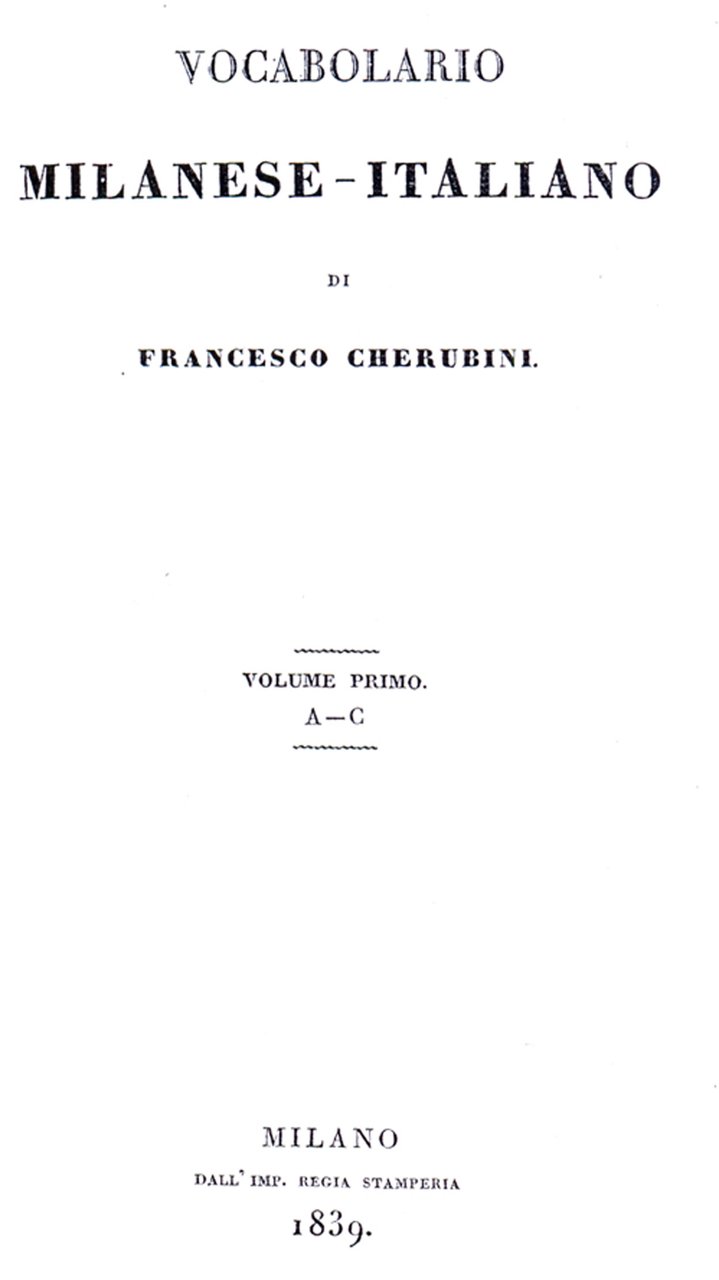 In-8 gr. (mm. 241x163), 5 volumi in 3 tomi, mezza pelle coeva, dorso con fregi e titolo oro, pp. L,(2),388; 428; (4),448; (4),556;(4),140 di Giunte e correzioni al vocabolario;(8) Elenco dei Signori associati - Il V vol., di "Supplemento", pp. XIX,308,(2), contiene "Nozioni filologiche intorno al dialetto milanese - Saggio d'osservazioni su l'idioma brianzuolo, suddialetto del milanese". "Seconda edizione", la migliore e di gran lunga la più ampia, di questa classica opera del Cherubini.Cfr. Predari,377 - Cat. Hoepli,122 - Cat. Binda,307.Ben conservati.