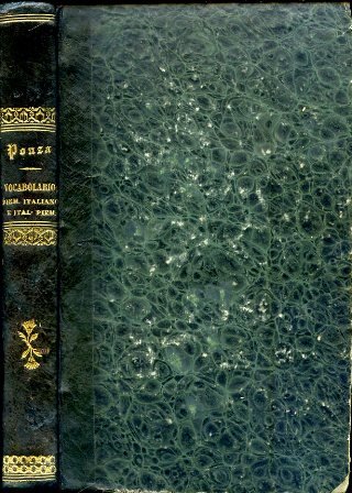 In-8°, pp. 140, 64, (6), 14, 72, 34, V, legatura coeva m. pelle nera con titolo, filetti e fregi ornamentali in oro al dorso. Piatti marmorizzati. Tagli a spruzzo. Bell'esemplare. Al fondo del volume è legato un opuscolo dello stesso Ponza in-16° di pp. 44, 2): 'Tavola e correzione d'un migliaio di errori di grammatica e di lingua da sfuggirsi da chi scrive italianamente', Torino, Tipografia Paravia, 1843. Rara edizione (edizione originale della parte italiano-piemontese, in quanto la prima edizione, del 1830-'32, non conteneva che la parte piemontese-italiano) del noto vocabolario della lingua piemontese del Ponza. L'autore, che sostiene la necessità di apprendere anche il dialetto per una corretta conoscenza dell'italiano, dichiara di essersi servito, tra le sue fonti, anche del dizionario piemontese del Brovardi, rimasto manoscritto. Il Ponza (Cavour, 1772-Torino, 1846) di nobile famiglia cavourese, dedicò la sua intera esistenza allo studio della lingua piemontese, pur asserendo fermamente che, in pieno Risorgimento, fosse necessario condividere innanzitutto la stessa lingua per 'fare gli italiani', superando così gli angusti steccati del regionalismo linguistico. Fu favolista dialettale, maestro di grammatica e Prefetto delle Scuole di Porta Nuova a Torino, letterato e filologo. 'Prove d'acuto ingegno, di pronto immaginare, di stile nervoso, vivace, colorato e frizzante ne diede molte in ogni tempo, in versi e in prosa. Ma la sua fama cominciò nel 1828 quando. richiamò col suo Annotatore degli errori di lingua certi imberbi supercritici allo studio della grammatica. L'Annotatore fu per qualche anno un buon giornale, ed ebbe il merito d'essere stato il primo a dar l'esempio in Piemonte di più libere discussioni', scrisse di lui il Cibrario. Clivio, 3138. Prati, Vocabolario delle parlate italiane, 522.