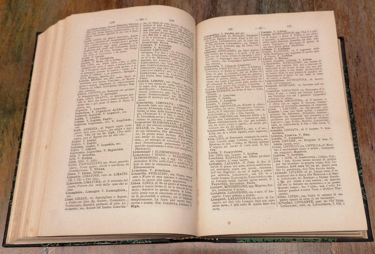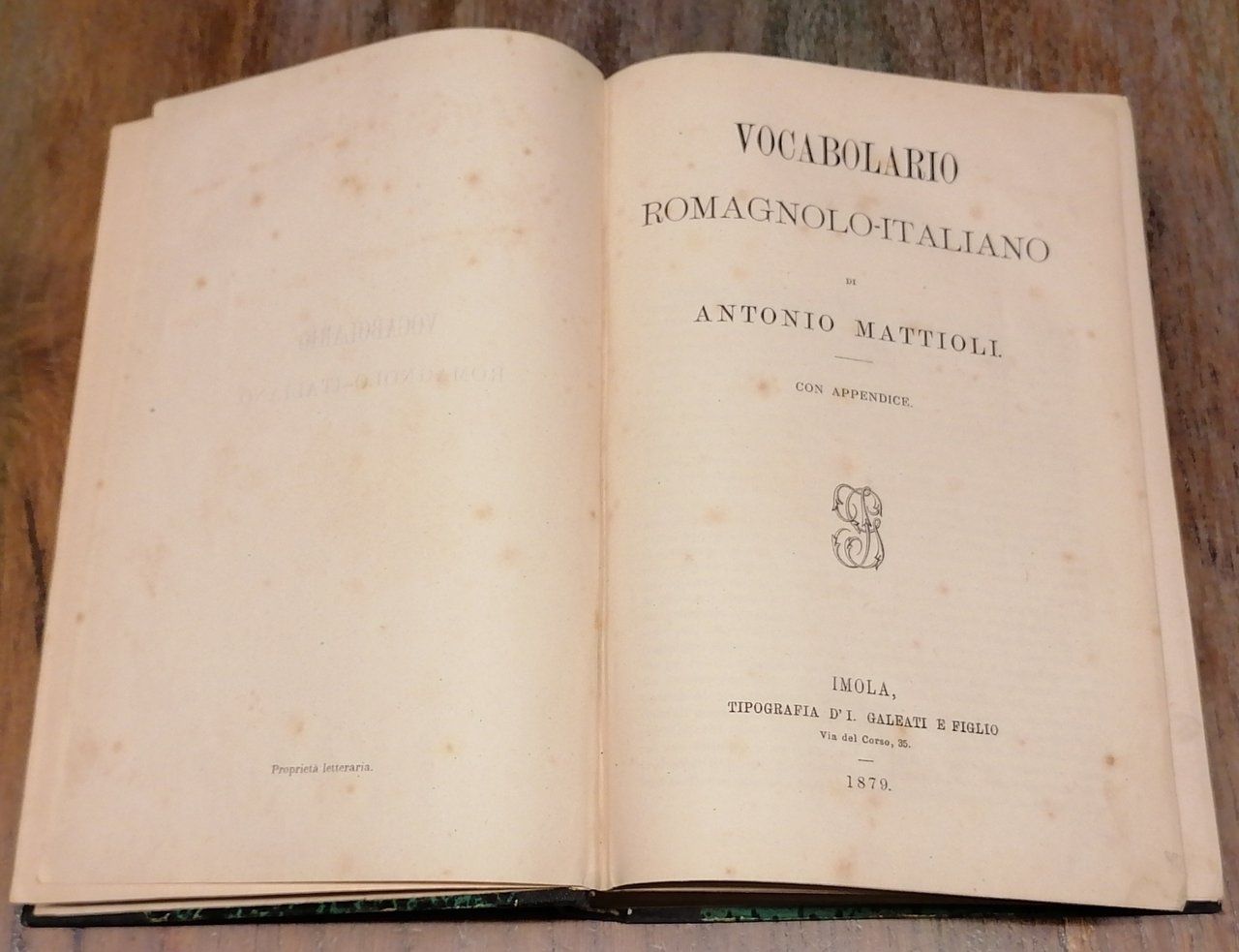 (Romagna; Dialetto romagnolo; Territorio imolese; Lessicografia dialettale) In 8°, legatura fine Ottocento in mezza tela nera con punte, titoli e filetti ornati impressi in oro al dorso, carta marmorizzata monocroma ai piatti, pp. IV,(2),775,(1). Testo su due colonne. Poche e leggere tracce di ossidazione ad alcune pagine, esemplare solido e molto ben conservato. Edizione originale del vocabolario del Mattioli dedicato ad una forma del dialetto romagnolo che Friedrich Schurr definisce nella sua opera "La voce della Romagna. Profilo linguistico-letterario" (p. 18) "piuttosto imolese".