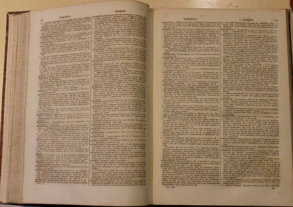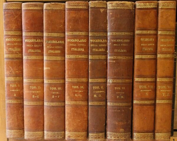 8 volumi in 4° grande (cm. 32 x 22,5), pp. viii - 725; (4) 814; (4) 785; (4) 735; (4) 587; (4) 986; (4) 775; (4) 603. Leg. dell'epoca mezza pelle con titoli e filetti oro sui dorsi. Si tratta della riproposizione di uno dei più celebri vocabolari italiani del XIX secolo, quello pubblicato dall'editore napoletano Tramater, qui rivisto ed accresciuto.
