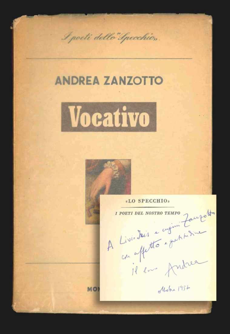 LIBROPrima edizione.CON AUTOGRAFO.Ottimo esemplare (usuale brunitura alla prima e all’ultima carta, tipica dei libri dello «Specchio»). Conserva il pergamino protettivo. Dedica autografa strettamente coeva dell’autore: «A Livio, Iris e cugini Zanzotto con affetto e gratitudine il loro Andrea[,] ottobre 1957».La terza raccolta di versi di Zanzotto, di forte rottura rispetto alle prime due raccolte dell’autore: «Parve a Giorgio Caproni “uno dei libri più belli del dopoguerra, riconoscibilmente nuovo” […] e già Sereni lo riteneva secondo solo a “La bufera e altro”. Pasolini non esitò a definirlo come un libro di “piena crisi” […], perché Zanzotto oggettivizza, problematizzandoli, i presupposti di ogni poesia soggettiva, a partire dall’io, ridotto alla sua «miseria di fatto “grammaticale”» (“Profili dei libri e note alle poesie”, a cura di S. Dal Bianco, in A. Zanzotto, “Le poesie e prose scelte”, 1999, p. 1435), come recita il risvolto di copertina, anonimo ma di mano dell’autore. Alla problematizzazione dell’io, in senso psichico, linguistico e storico-letterario, si uniscono quella del colloquio, ridotto alla pura vocatività, e della lingua, avvertita come transeunte. Michel David parlò poi di “inconsapevole lacanismo” […] per il grammaticalismo di questo ‘secondo’ Zanzotto, che irrompe anche come poeta del linguaggio» Carmelo Princiotta, «Zanzotto», voce del «Dizionario biografico degli Italiani», volume 100, 2020).