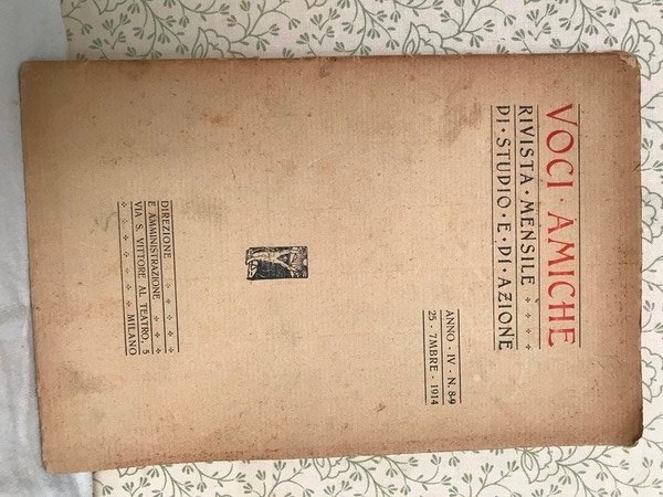 Fascicolo in 8, brossura editoriale, titolo al piatto, da pagg 289 a pag 336 (47 pp.) la rivista 'Voci Amiche' nasce nel 1911 a Lodi come una delle prime forme di giornalismo femminile, e viene stampata fino al 1916 trasformandosi in 'Rivista mensile di studio e di azione' sotto la direzione di Carlo Bresciani. Volume in buone condizioni, interessante e poco comune.