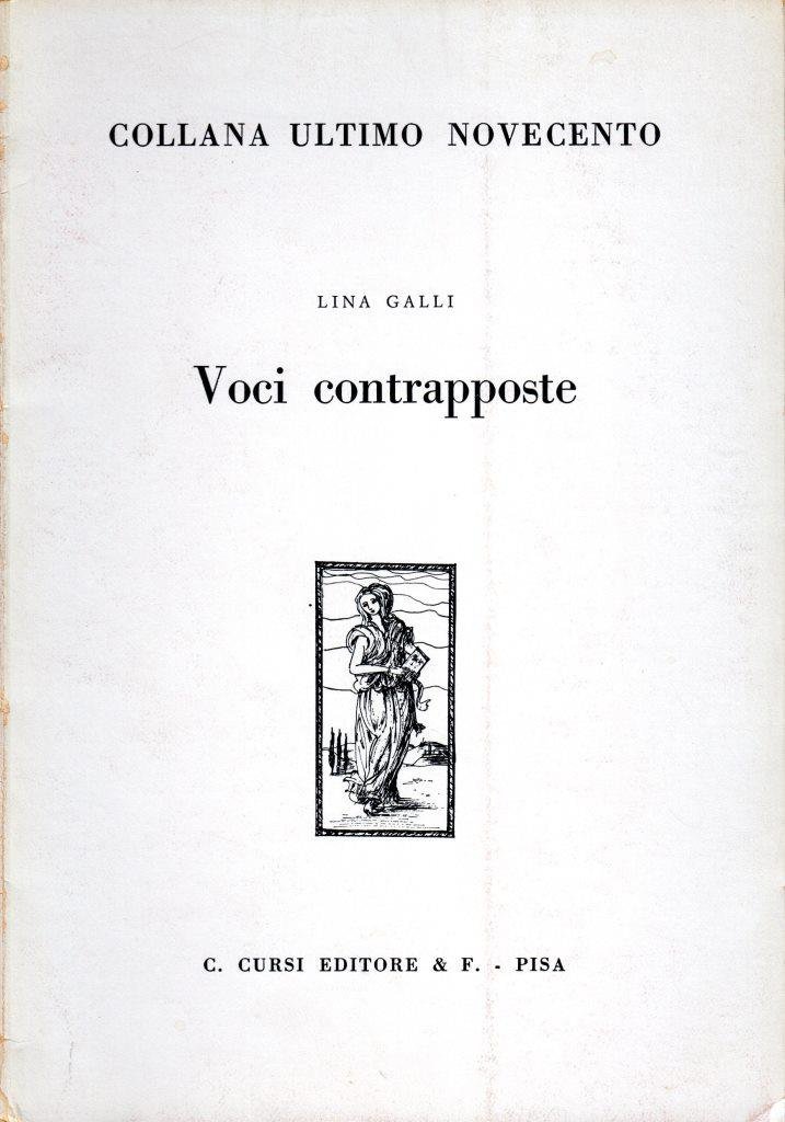 Voci contrapposte, prima edizione giugno 1977, pp. 18, formato 15 x 21.<BR>Copertina morbida illustrata di colore bianco con titoli in nero al piatto anteriore. In prima pagina presente dedica dell'autrice alla scrittrice Minnie Alzona, datata 7 giugno 1978. <BR>Ottime condizioni.