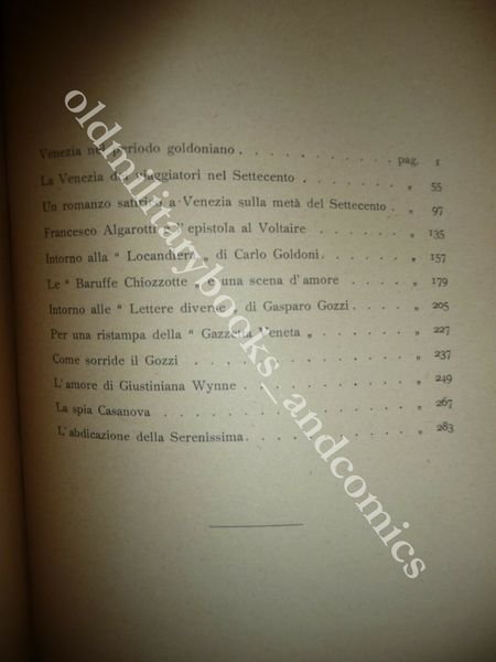 DESCRIZIONE: Zanichelli Ed. Bologna s.d. ma 1926 I^ Ed. br. ed. pp. 290 in 8°. Contiene: "Venezia nel periodo goldoniano - La Venezia dei viaggiatori nel Settecento - Un romanzo satirico a Venezia sulla metà del Settecento - Francesco Algarotti e l'epistola al Voltaire - Intorno alla "Locandiera" di Carlo Goldoni - Le "Baruffe Chiozzotte" e una scena d'amore - Intorno alle "Letture diverse" di Gasparo Gozzi - Per una ristampa della «Gazzetta Veneta» - Come sorride il Gozzi - L'amore di Giustiniana Wynne - La spia Casanova - L'abdicazione della Serenissima". CONDIZIONI: Ottime. PESO / WEIGHT: 540 gr. without package