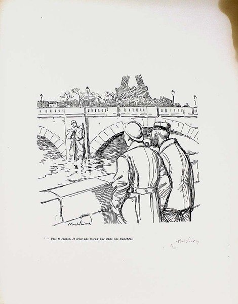 Abel Jules Faivre (Lione 1867 - Nizza 1945) Litografia originale firmata a mano dall'artista.Dimensioni: 56 x 38,5 cmCon certificato di autenticità C.O.A.Ingiallimento laterale come da foto.Esemplare numero 62/250 La raccolta di litografie umoristiche del caricaturista francese Abel Faivre (Lione 1867-Nizza 1945), andata a confluire nel volume Jours de guerre,fu pubblicata in due tomi tra il 1915 e il 1919. Con il procedere del conflitto, l'opinione pubblica di tutti i paesi coinvolti,che aveva dapprima affrontato tale evento con ottimismo, mutò rapidamente opinione sino a considerare la guerra, senza mezzi termini,come un avvenimento rovinoso. In tale contesto, le vignette satiriche di guerra possedevano un potente effetto catartico,adempivano un ruolo sociale irrinunciabile, fornendo una valvola di sfogo all’incombere dal più cupo pessimismo. Abel Jules Faivre (Lyon 1867 - Nizza 1945) Originale Lithographie vom Künstler von Hand signiert.Abmessungen: 56 x 38,5 cmMit Echtheitszertifikat C.O.A.Seitliche Vergilbung wie auf dem Foto.Kopieren Sie die Nummer 62/250 Die Sammlung humorvoller Lithographien des französischen Karikaturisten Abel Faivre (Lyon 1867-Nizza 1945), die in den Band Jours de guerre floss,es wurde zwischen 1915 und 1919 in zwei Bänden veröffentlicht. Im Verlauf des Konflikts wurde die öffentliche Meinung in allen beteiligten LändernWer dieses Ereignis anfangs mit Optimismus konfrontiert hatte, änderte schnell seine Meinung, um den Krieg ohne Zweifel zu betrachten.wie ein ruinöses Ereignis. In diesem Zusammenhang hatten die satirischen Kriegskarikaturen eine starke kathartische Wirkung.Sie erfüllten eine unverzichtbare soziale Rolle und bildeten ein Entlastungsventil gegen den dunkelsten Pessimismus. Abel Jules Faivre (Lyon 1867 - Nice 1945) Lithographie originale signée à la main par l'artiste.Dimensions: 56 x 38,5 cmAvec certificat d'authenticité C.O.A.Jaunissement latéral comme sur la photo.Copie numéro 62/250 La collection de lithographies humoristiques du caricaturiste français Abel Faivre (Lyon 1867-Nice 1945), qui allait se fondre dans le volume Jours de guerre,il a été publié en deux volumes entre 1915 et 1919. À mesure que le conflit progressait, l'opinion publique de tous les pays impliqués,qui avait d'abord fait face à cet événement avec optimisme, a rapidement changé d'avis pour envisager la guerre, en termes non équivoques,comme un événement ruineux. Dans ce contexte, les caricatures de guerre satiriques ont eu un puissant effet cathartique,ils remplissaient un rôle social indispensable, fournissant une soupape de décharge du pessimisme le plus sombre. Abel Jules Faivre (Lyon 1867 - Nice 1945) Original lithograph signed by hand by the artist.Dimensions: 56 x 38.5 cmWith certificate of authenticity C.O.A.Lateral yellowing as in the photo.Copy number 62/250 The collection of humorous lithographs by the French caricaturist Abel Faivre (Lyon 1867-Nice 1945), which went to flow into the volume Jours de guerre,it was published in two volumes between 1915 and 1919. As the conflict progressed, public opinion in all the countries involved,who had initially faced this event with optimism, quickly changed his opinion to consider the war, in no uncertain terms,like a ruinous event. In this context, the satirical war cartoons had a powerful cathartic effect,they fulfilled an indispensable social role, providing a relief valve from the darkest pessimism.