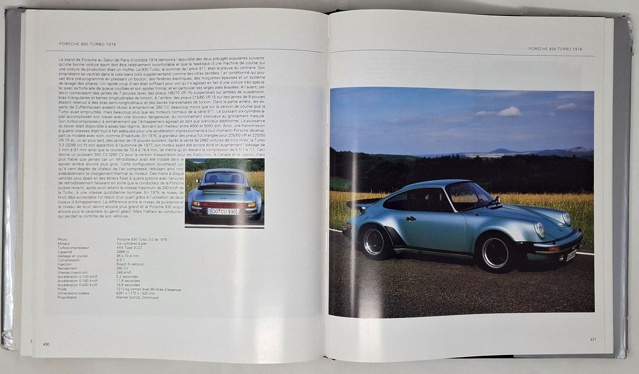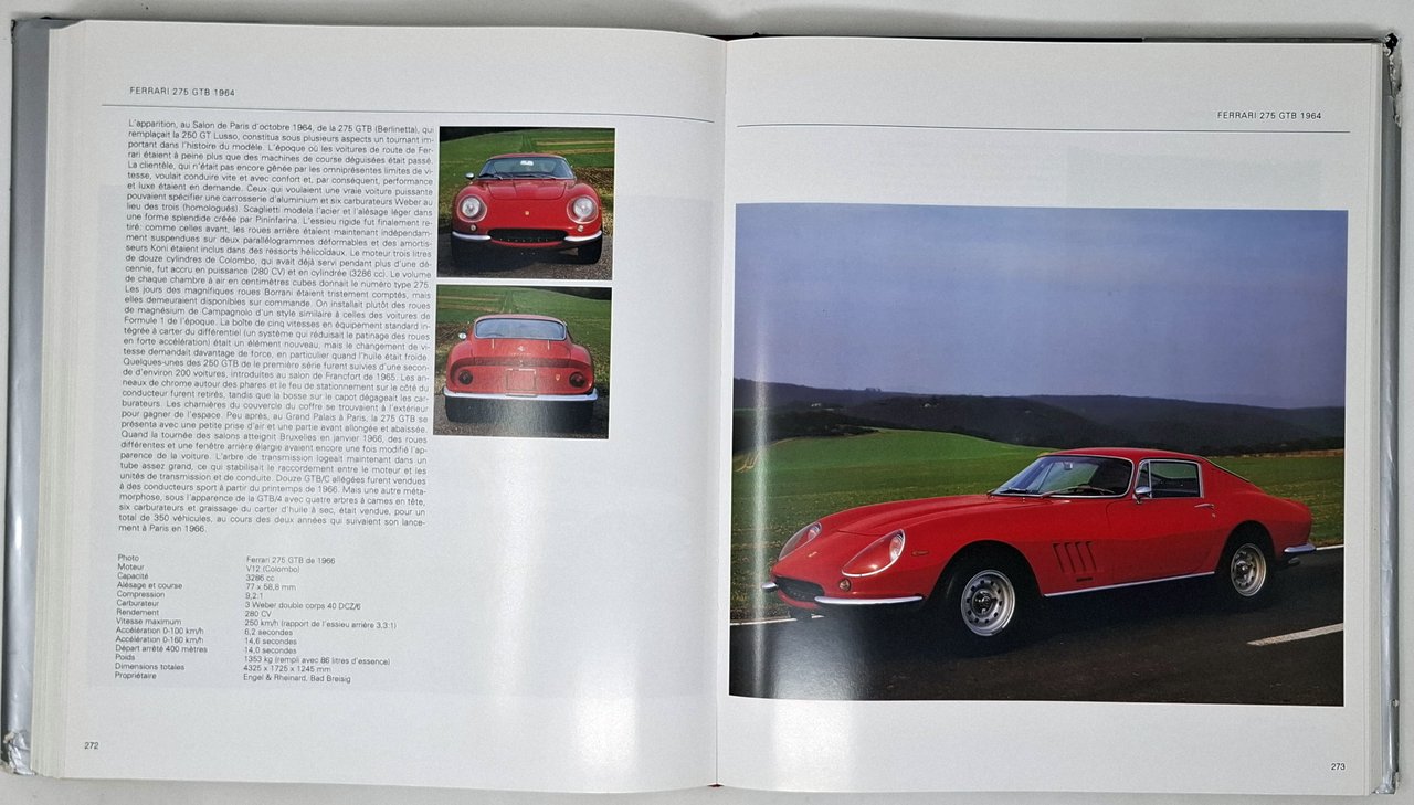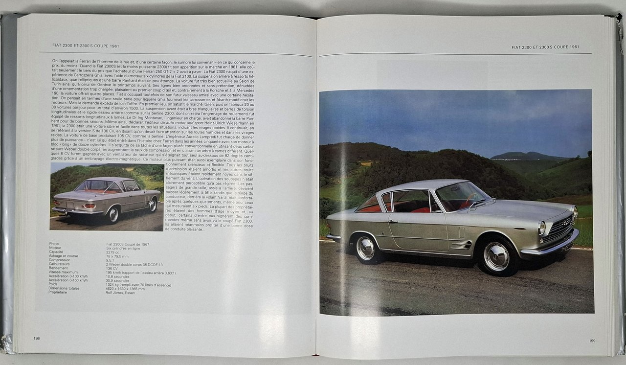 Photos: Frank Oleski. Texte: Hartmut Lehbrink.Traduction: Rene Houle. Lingua del testo: francese. Pagine: 463 + [5]. Formato: 26,5 x 30,5 cm circa. Stato di conservazione: segni di usura esclusivamente sulla sovraccoperta che presenta strappi e abrasioni sugli spigoli ma volume decisamente ben conservato (si segnala solo una piccola abrasione sullo spigolo superiore del piatto posteriore e un ritaglio di giornale 'Les accidents mortels en F1' attaccato con quattro piccoli pezzetti di nastro adesivo trasparente sulla prima pagina bianca. Copertina editoriale cartonata rigida in tutta tela blu con titoli in oro sul piatto anteriore e sul dorso e sovraccoperta illustrata a colori. Opera ricchissima di immagini fotografiche a colori molte delle quali a piena pagina. Tra i numerosi modelli di macchine presenti segnaliamo: MG TC 1945, Triumph Roadster 1800 et 2000 1946, Alfa Romeo 6C 2500 sport et super sport 1947, Jaguar XK 120 1948, Aston Martin DB2 1950, Ferrari 250 Mille Miglia 1950, Porsche 356 1950, Alfa Romeo 1900 sprint et super sprint 1951, Lancia Aurelia coupe B20 et spider B24 1951, Maserati A6G 2000 1951, Fiat 8V 1952, AC ACE et ACECA Bristol 1953, Chevrolet et Corvette 1953, Ferrari 250 Europa 1953, MG TF 1953, Sunbeam Alpine 1953, Triumph TR2 1953, Alfa Romeo Giulietta coupes et spider 1954, Jaguar XK 140 1954, Jensen 541 1954, Mercedes-benz 300 SL 1954, BMW 507 1955, MGA 1955, Morgan 4/4 et 1600 1955, Porsche 356 A 1955, Triumph TR3 1955, Chevrolet et corvette 1956, Ferrari 250 GT Boano/Ellena 1956, Ferrari 250 GT berlinetta tour de France 1956, Alfa Romeo 2000/2600 coupes et spider 1957, Alpine-Renault A 108 et A 110 1957, Lotus Elite 1957, Maserati 3500 GT 1957, Aston Martin DB4 1958, Daimler SP250 1959, Jaguar E-type 1961, Iso rivolta 1962, Porsche 011 et 912 1963, AC 428 1965, Aston Martin DB6 1965, Ferrari 330/365 GTC et GTS 1966, Fiat Dino 1966, Jensen Interceptor 1966, Lamborghini P 400 Miura 1966, Maserati Ghibli 1966, Ferrari 365 GT 2 + 2 1967, Monteverdi 375 1967, Ferrari 365 GTB/4 et GTS/4 Daytona 1968, Intermeccanica Italia 1968, lamborghini 400 GT espada 1968, Lamborghini Urraco et silhouette 1970, De Tomaso Pantera 1970, Ferrari Berlinetta Boxer 1971, Maserati Bora 1971,Lancia Stratos HF 1974, Lancia Beta Montecarlo 1975, .