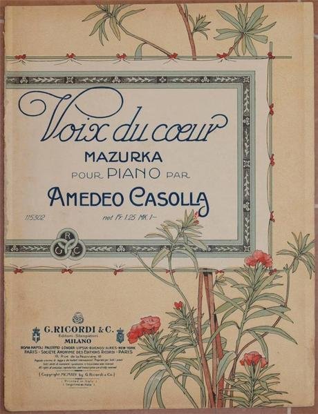 Formato cm. 33x25. Pp. 4. Bello spartito del 1914 della melodia mazurka "Voix du coeur" per pianoforte. Musica di Amedeo Casolla. Bella copertina liberty. In buone condizioni con rare fioriture e usure al dorso. Legatura assente. Dedica al frontespizio con firma autografa di Casolla. Beautiful musical score of 1914 of the mazurka melody "Voix du coeur" for piano.ì Music by Amedeo Casolla. Beautiful decorated cover in liberty style Dedication in the first page with signature of Casolla. In very good conditions with occasional foxings and wearings.<BR><BR>