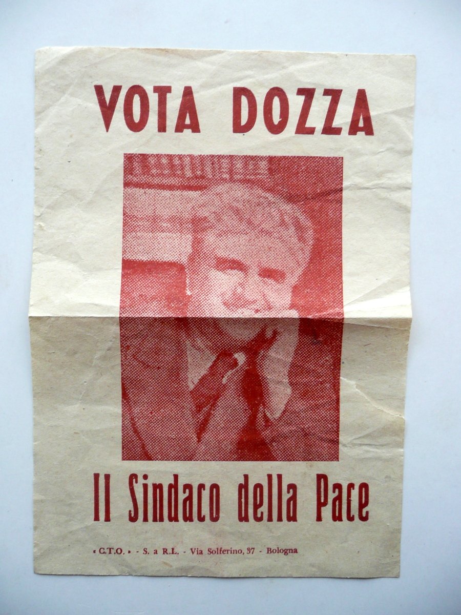 Volantino, Vota Dozza il Sindaco della Pace" "C. T. O." S. a R. L., Bologna, s. d. (fine anni '40 - anni '50 del Novecento circa); volantino a stampa su carta con una ill. fotogr. di Giuseppe Dozza virata al rosso. Cm 17x12. Condizioni di conservazione Esemplare complessivamente ben conservato con tracce d'uso, normale piega centrale di conservazione, leggerissime stropicciture; un margine est. con uno strappetto di qualche cm (vedi foto). SC03.D10895 N "