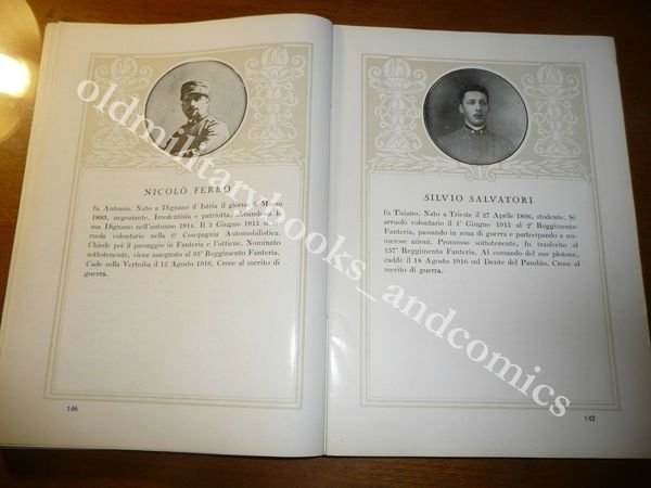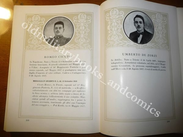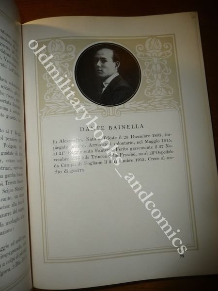 DESCRIZIONE: Officine Grafiche de la Editoriale Libraria Trieste 1928 pp. XXIV+436 ill. con f. b/n in 8° g. Vol. in mz tela d'epoca che non conserva la sua copertina originale all'interno. Numerosi ritratti fotografici accompagnati da schede biografiche dei morti per la patria durante la Prima Guerra Mondiale e dopo la Vittoria, nonche' delle Medaglie d'Oro Viventi. Al fine Albo dei Volontari Giuliani e Dalmati. CONDIZIONI: Ottime/Perfette. PESO / WEIGHT: 1237 gr. without package