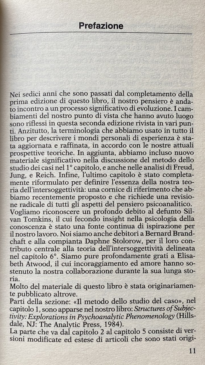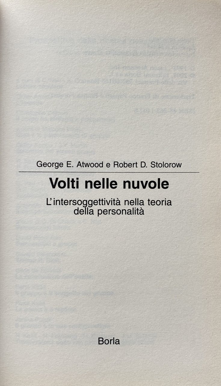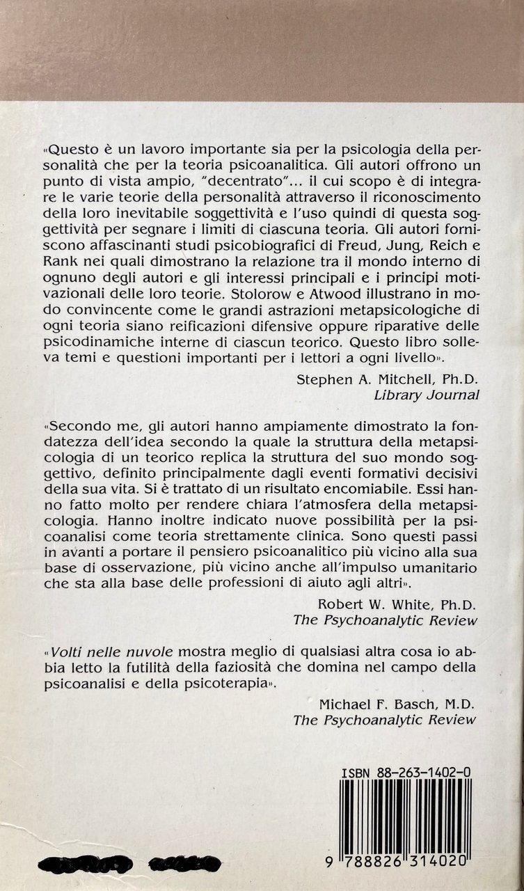 Introduzione all'edizione italiana. Siamo particolarmente contenti che una traduzione del nostro primo libro compaia in questo momento in cui il nostro punto di vista sta subendo un processo di maturazione verso una teoria psicoanalitica post-cartesiana. Una caratteristica essenziale della psicoanalisi post-cartesiana è il suggerimento che tutti i prodotti psicoanalitici sono inclusi in contesti costitutivi. I semi di questa idea possono essere trovati negli studi psicobiografici originali, iniziati una trentina di anni fa, che hanno costituito la base per Volti nelle nuvole. In questi studi, abbiamo dimostrato che le teorie psicoanalitiche non possono essere separate dai loro contesti personali di origine nelle storie di vita e nei mondi soggettivi dei loro creatori. Negli anni seguiti alla pubblicazione della prima edizione di Volti nelle Nuvole 1979, il nostro pensiero sulle origini soggettive delle teorie psicoanalitiche si è gradualmente evoluto in una teoria sistemica intersoggettiva per la psicoanalisi come un tutto. Con la pubblicazione di questa traduzione, i nostri colleghi italiani hanno ora l'opportunità di seguire questa evoluzione teorica. Un grande ringraziamento a Franco Paparo per il suo lavoro a questo progetto.