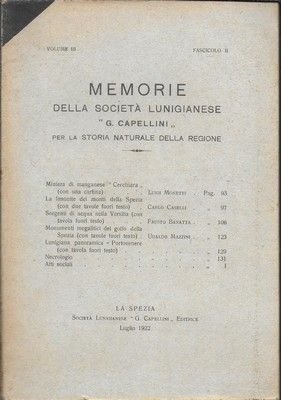 Due fascicoli In-8°, legatura in brossura editoriale, pp. da 95 a 169(VIII). Contiene:- MONETTI L.-Miniera di manganese 'Cerchiara', con cartina. -CASELLI C. La limonite dei monti della Spezia, con due tavole fuori testo. - BARATTA F. Sorgenti di acqua nella Versilia, con tavola fuori testo. MAZZINI U. Monumenti megalitici del golfo della Spezia, con due tavole. - Lunigiana panoramica - Portovenere, con una tavola fuori testo. Fascicolo III- MAZZINI U. Nuove statue-Menhir di Val di Magra, 1 tavola. - CASELLI C. L'arenaria bassa. SFORZA G. Scienziati Lunigianesi - Ettore Celi. - MAZZINI U. Alcune osservazioni intorno ad un antico 'Lapis terminalis, con una tavola. - Sittoni G. La discriminazione delle forme craniensi in Val di Magra, 1 tavola.