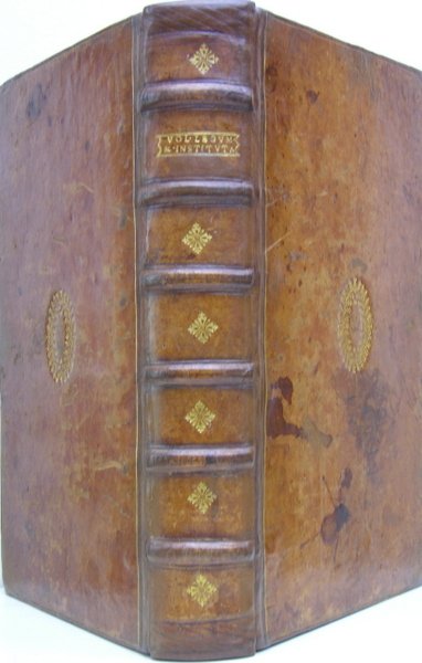 Lugduni, Sumptibus Petri Landry, 1604. Fort in folio, reliure plein veau roux, dos à nerfs à fleurons et titre doré, plat avec couronne fleurie et filet dorés sur les plats, page de titre imprimée en noir et rouge, grande vignette centrale, texte sur deux colonnes avec nombreuses gloses, lettrines historiées, 6 f, 324 col., 4 f., 640 col., 10 f., 198 col., 8 f., 564 col.Restauration habile de la reliure. Plats tachés. Page de garde restaurée, 1 feuillet avec petite déchirure sans manque, rousseurs et texte oxydé. D. Gothofredi (Paris 1549 - Strasbourg 1622) étudie le droit à Paris, Louvain, Cologne, Heidelberg, Orléans. Donne des cours à l’Académie de Genève. Son grand oeuvre “Corpus Juris Civilis” édition commentée de l’intégralité de la codification de l’Empereur Justinien. Cet ouvrage comptera plus de 50 éditions distinctes ! Gothofredi en donnera lui-même 3 éditions distinctes avec la glose en 1587, la nôtre en est la seconde.Fat Fo in full calf binding, ribbed spine with gilt fleurons & title, gilt fillet & small gilt oval crown of flowers on boards, red & black printed title page with large vignette, text in 2 columns and gloss, historical letters, [6], 324 col., [4], 640 col., [10], 198 col., [8], 564 col. Some flaws : skillfull repair of the spine, spoted boards, restaured initial blank, small tear without loss on one leaf, throughout foxing and browning.