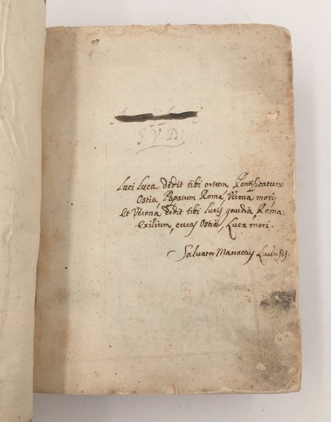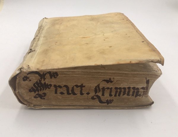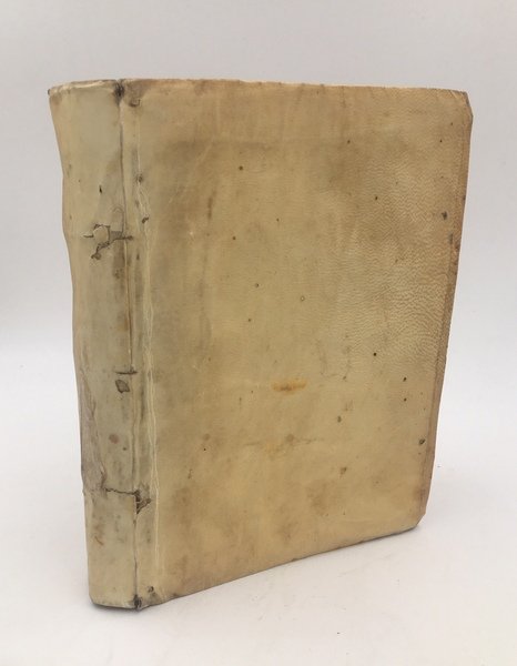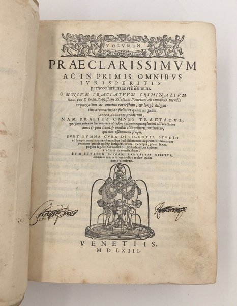 In-8° (cm. 20.6x15,3), carte (68).non num., 416 cc. num. (= pp. 968), legatura tutta pergamena floscia, al dorso e presso le cerniere piccole mancanze di pergamena professionalmente risarcite, superba marca tipografica (FONTANA di 12 zampilli da un vaso e dal putti gaiamente orinanti, che lo sorreggono), 32 RITRATTI incisi (cm. 4x5, ma uno di cm. 9,8x6, il Placentinus con scolari) di giureconsulti, molti capilettera ornati, gran titolo calligrafico coevo al taglio inferiore, testo nitido e fittissimo su due colonne. Eccellente, solido e perlopiù immacolato esemplare, pur con lievi fioriture, gore e macchioline a varie pagine, Alla sguardia nome d'appart. anticam. cancellato e davvero sibillina strofa calligrafica coeva in 4 versi latini, firmata "Salvator Manaceus Lucensis" (cioè di LUCCA) alludente alla tormentata vicenda di Lucio III (che non nomina) nato a Lucca (1097), vescovo di Ostia, papa a Roma ma esiliato, morto a Verona; al front. altra firma di appartenenza anticam. cancellata. Ricco repertorio cinquecentesco contenente una raccolta di TRATTATI di 32 autori raccolti ed emendati da ZILETTI famoso giureconsulto veneto: de accusationibus, de crimine laese maiestatis, de persecutionibus, Giov. Franc. PONZIO da Parma: de LAMIIS (= STREGHE, 39 fitte colonne, in cui saggiamente nega il sabba diabolico), Paolo GHIRLANDO, de SORTILEGIIS (118 colonne), de HAERETICIS eorumque POENIS (4 trattati, 204 colonne), de fuga, de carceribus, de indiciis et TORTURA, de quaestionibus et tormentis (116 col.), de BANNITIS (cioè esiliati) di Iacopus De Arena (178 colonne), de modo procedendi contra APOSTATAS, COITUS contra naturam ecc. ecc. A richiesta, titoli ed Autori dei vari TRATTATI. Cimelio tipografico del grande COMINO da TRINO nel MONFERRATO. Raro e prezioso di sterminati contenuti, non solo giuridici!.