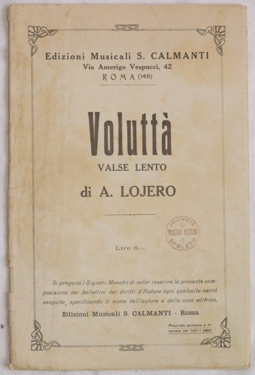 In 8. cm 26,5x18. pp. 7. Partitura completa per orchestra senza data ma degli anni '30 di una canzone. Caratteristica copertina decorata dell'epoca. Ex libris sulla copertina. Buone condizioni; usure e strappi al dorso; fioriture in copertina. A complete score for orchestra not dated but of 1930's. Carachteristic decorated cover of that period. Ex libris in the cover. Good conditions, worn spine with tears; brownings in the cover.