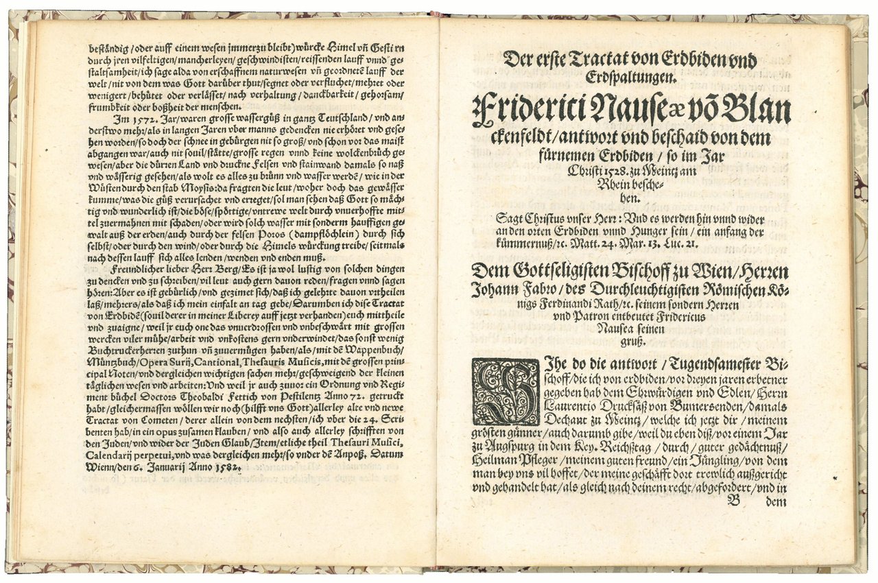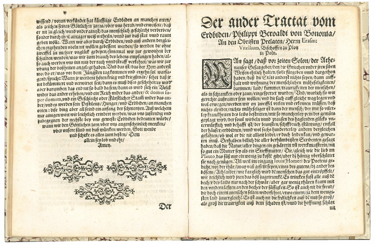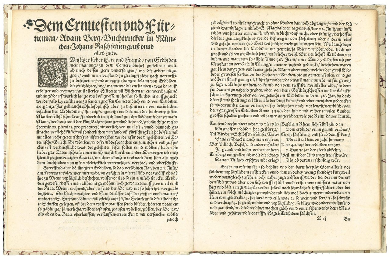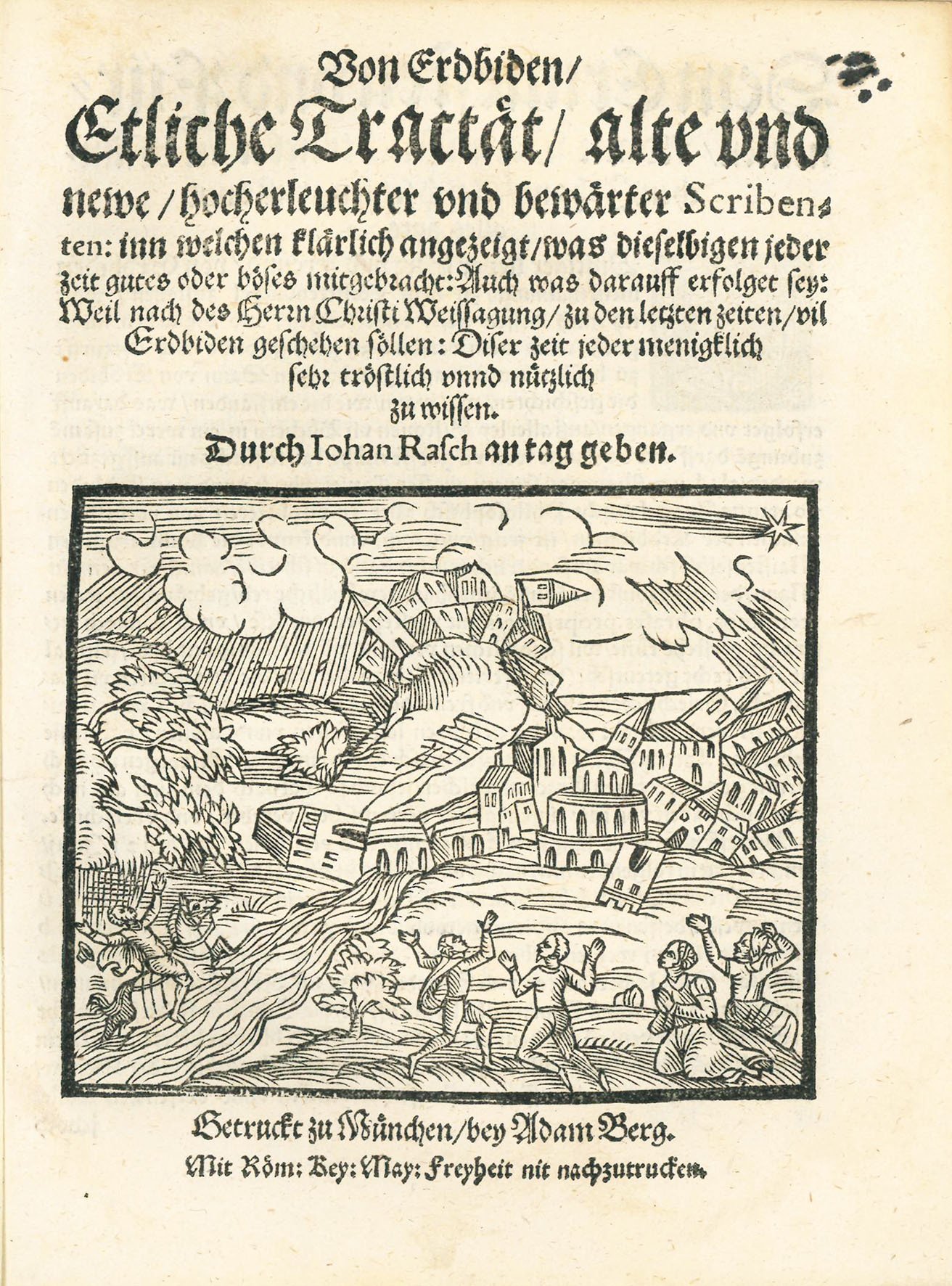 Very rare first edition. Apart a didactic poem by an anonymous author on the earthquake in Bavaria of 1511, this seems to be the first general treatise on this subject in German. The work opens with a long letter by Rasch to the printer Adam Berg, dated Vienna January 6, 1582, in which he writes about the difficulties to compose a book on earthquakes and holds theoretical speculations worthless. He tells about the earth-shock who took place at Vienna in July 1581, which however did not cause such great harm as the terrible earthquake that happened in southern Germany in 1348, which was still remembered by Rasch's contemporaries in form of a poem.