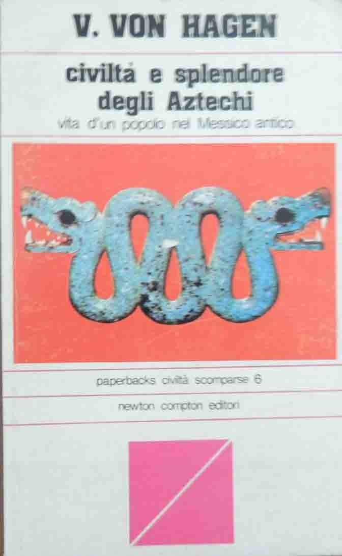 Victor W. Von Hagen, Civiltà e splendore degli Aztechi, traduzione di Gualtiero Stefanon, illustrazioni di Alberto Beltrán, Newton Compton editori, Roma 1977, prima ed., pp. 219, ill. b.n., 8 c. di tavv. b.n., cm 20, br. ed. Collana Paperbacks. Civiltà scomparse, n. 6. The Aztec: man and tribe. Ex libris applicato al fontespizio. Minime tracce d’uso, carta uniformemente brunita, per il resto buona copia.