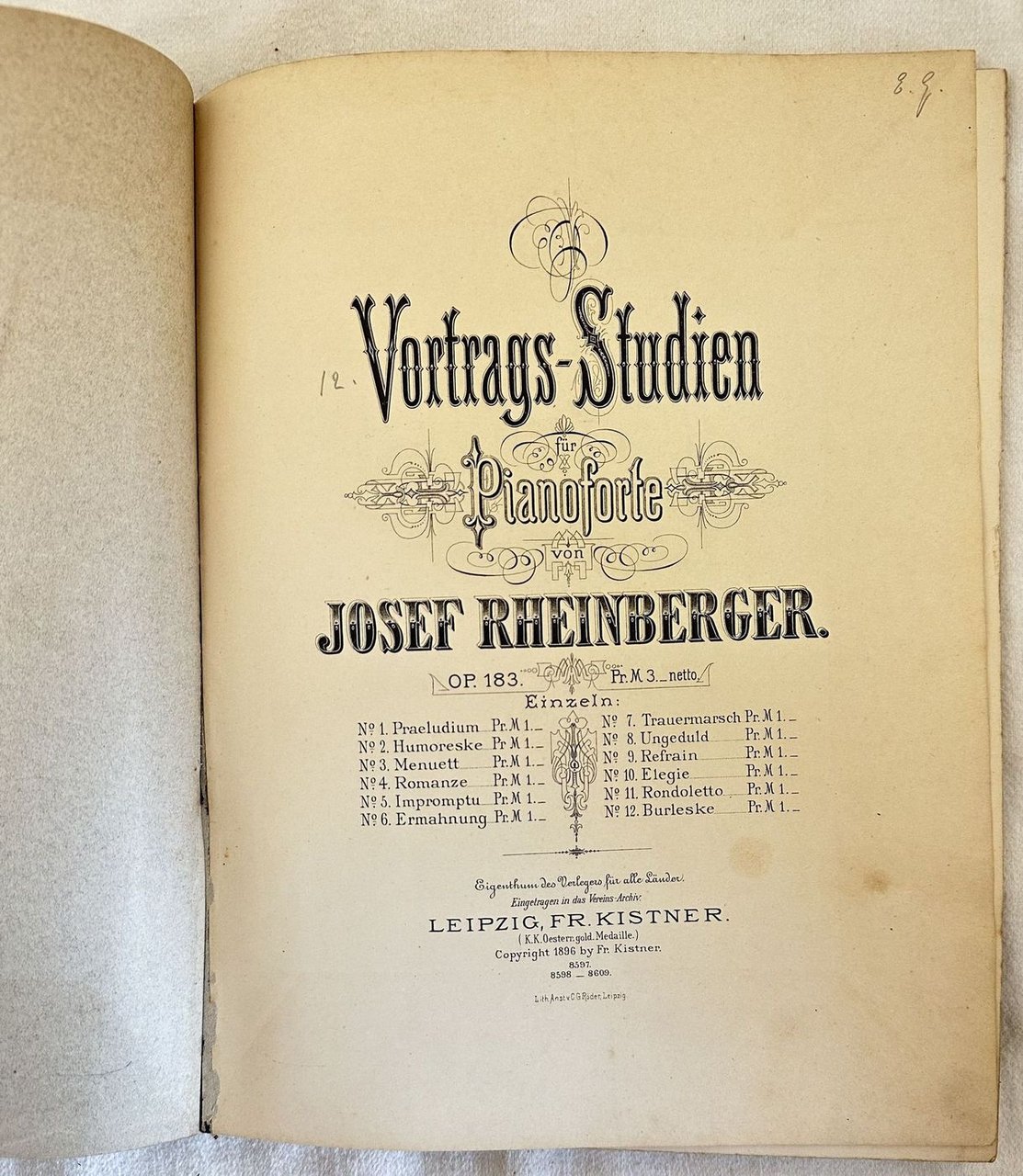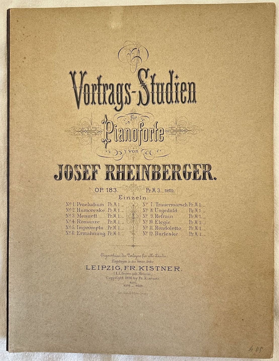 Edizione del 1896 dell'opera 183 per pianoforte "Vortrags-studien" del compositore del Liechtenstein Josef Rheinberger (1839-1901). In buone condizioni. Copertina editoriale in buone condizioni con lievi usure marginali. Piatto anteriore in parte staccato. Legatura in buone condizioni. Pagine in ottime condizioni con rare fioriture. In folio. cm. 31x23,5. Pp. 45.Edition of1896 of the opera 183 for piano "Vortrags-studien" by the composer Liechtenstein Josef Rheinberger (1839-1901). In good conditions. Editorial cover in good conditions with lightly worn in the extremities. Binding in good conditions. Pages in very good conditions with occasional foxing.In folio. cm. 31x23,5. Pp. 45.