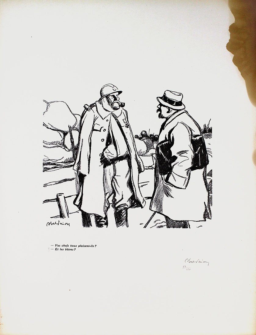 Abel Jules Faivre (Lione 1867 - Nizza 1945) Litografia originale firmata a mano dall'artista.Dimensioni: 56 x 38,5 cmCon certificato di autenticità C.O.A.Ingiallimento laterale come da foto.Esemplare numero 62/250 La raccolta di litografie umoristiche del caricaturista francese Abel Faivre (Lione 1867-Nizza 1945), andata a confluire nel volume Jours de guerre,fu pubblicata in due tomi tra il 1915 e il 1919. Con il procedere del conflitto, l'opinione pubblica di tutti i paesi coinvolti,che aveva dapprima affrontato tale evento con ottimismo, mutò rapidamente opinione sino a considerare la guerra, senza mezzi termini,come un avvenimento rovinoso. In tale contesto, le vignette satiriche di guerra possedevano un potente effetto catartico,adempivano un ruolo sociale irrinunciabile, fornendo una valvola di sfogo all’incombere dal più cupo pessimismo. Abel Jules Faivre (Lyon 1867 - Nizza 1945) Originale Lithographie vom Künstler von Hand signiert.Abmessungen: 56 x 38,5 cmMit Echtheitszertifikat C.O.A.Seitliche Vergilbung wie auf dem Foto.Kopieren Sie die Nummer 62/250 Die Sammlung humorvoller Lithographien des französischen Karikaturisten Abel Faivre (Lyon 1867-Nizza 1945), die in den Band Jours de guerre floss,es wurde zwischen 1915 und 1919 in zwei Bänden veröffentlicht. Im Verlauf des Konflikts wurde die öffentliche Meinung in allen beteiligten LändernWer dieses Ereignis anfangs mit Optimismus konfrontiert hatte, änderte schnell seine Meinung, um den Krieg ohne Zweifel zu betrachten.wie ein ruinöses Ereignis. In diesem Zusammenhang hatten die satirischen Kriegskarikaturen eine starke kathartische Wirkung.Sie erfüllten eine unverzichtbare soziale Rolle und bildeten ein Entlastungsventil gegen den dunkelsten Pessimismus. Abel Jules Faivre (Lyon 1867 - Nice 1945) Lithographie originale signée à la main par l'artiste.Dimensions: 56 x 38,5 cmAvec certificat d'authenticité C.O.A.Jaunissement latéral comme sur la photo.Copie numéro 62/250 La collection de lithographies humoristiques du caricaturiste français Abel Faivre (Lyon 1867-Nice 1945), qui allait se fondre dans le volume Jours de guerre,il a été publié en deux volumes entre 1915 et 1919. À mesure que le conflit progressait, l'opinion publique de tous les pays impliqués,qui avait d'abord fait face à cet événement avec optimisme, a rapidement changé d'avis pour envisager la guerre, en termes non équivoques,comme un événement ruineux. Dans ce contexte, les caricatures de guerre satiriques ont eu un puissant effet cathartique,ils remplissaient un rôle social indispensable, fournissant une soupape de décharge du pessimisme le plus sombre. Abel Jules Faivre (Lyon 1867 - Nice 1945) Original lithograph signed by hand by the artist.Dimensions: 56 x 38.5 cmWith certificate of authenticity C.O.A.Lateral yellowing as in the photo.Copy number 62/250 The collection of humorous lithographs by the French caricaturist Abel Faivre (Lyon 1867-Nice 1945), which went to flow into the volume Jours de guerre,it was published in two volumes between 1915 and 1919. As the conflict progressed, public opinion in all the countries involved,who had initially faced this event with optimism, quickly changed his opinion to consider the war, in no uncertain terms,like a ruinous event. In this context, the satirical war cartoons had a powerful cathartic effect,they fulfilled an indispensable social role, providing a relief valve from the darkest pessimism.