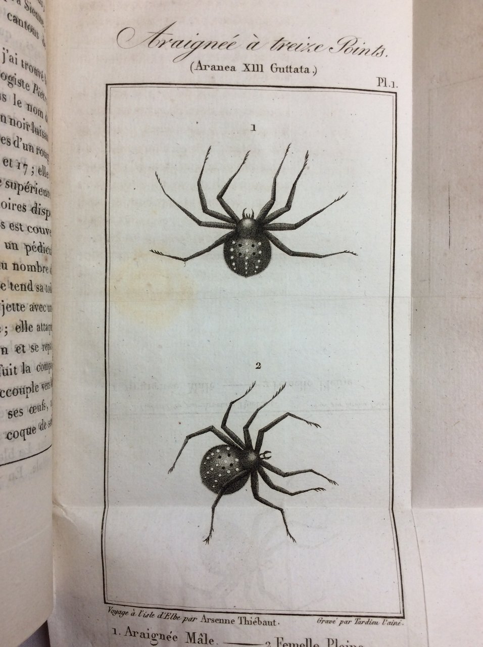 In-8 p. (mm. 200x188), mz. pelle coeva, fregi e titolo oro al dorso (restaur. per picc. manc.), pp. (6),XVI,231, con 3 tavole incise in rame da P. A. Tardieu, più volte ripiegate fuori testo, che raffigurano: una carta topografica, antiche medaglie etrusche ed una specie particolare di ragno presente sull'Elba."Prima edizione" di questa ampia e dettagliata descrizione dell'Isola. Interessanti anche le ultime 20 pp. dell'opera che contengono notizie sulle isole di: Pianosa, Monte Cristo, Giglio, Sardegna, Corsica, Capraia e Gorgona. Cfr. Pine-Coffin, p. 151 (per la traduzione inglese, Londra, 1814): Based on the three visits to the island between 1801 and 1807. The original was published in Paris, 1808 - Brunet,Table,20211.Esemplare ben conservato.