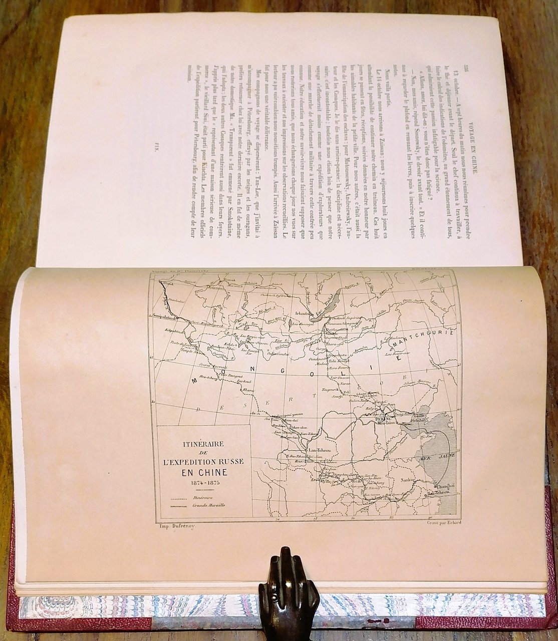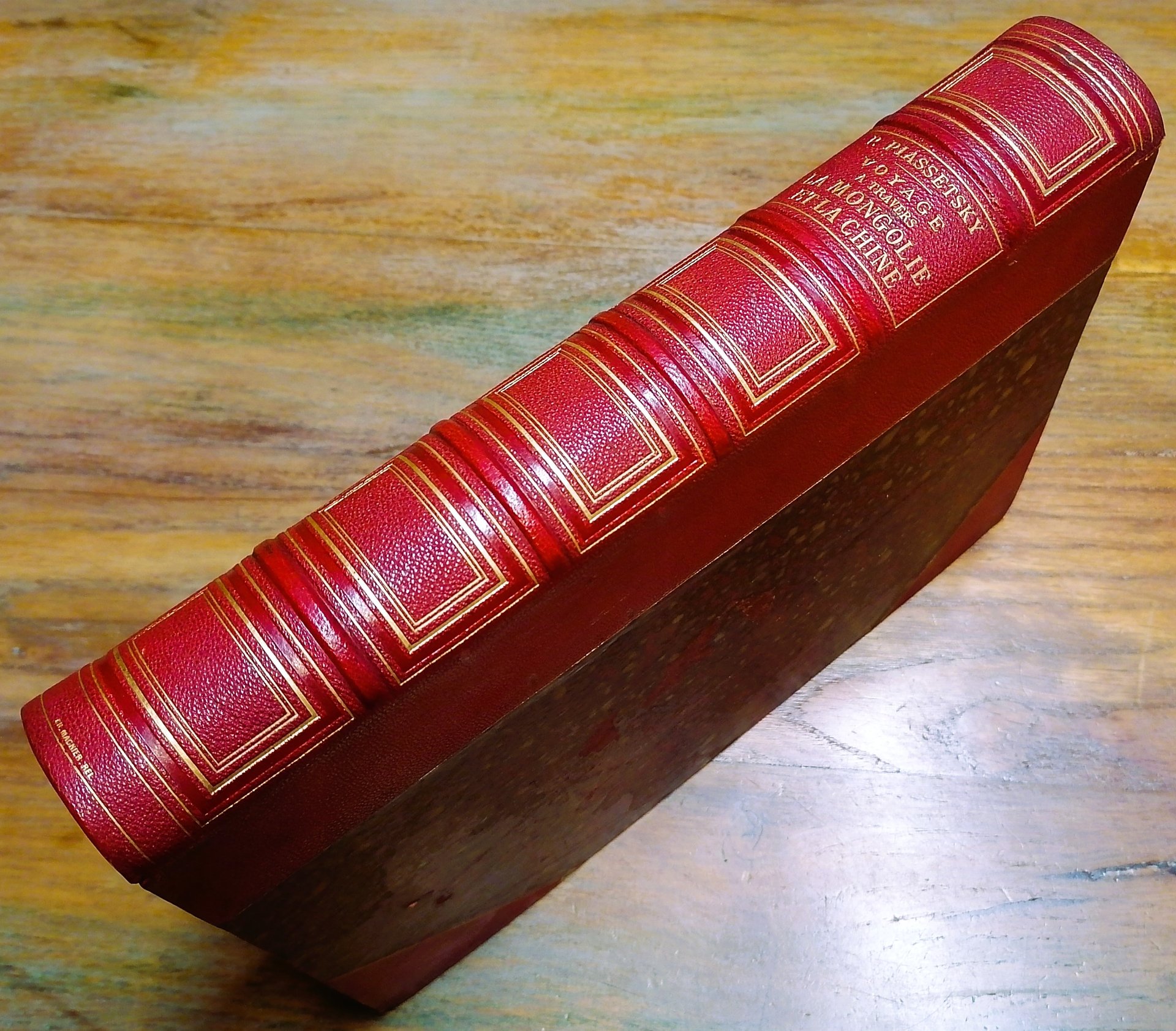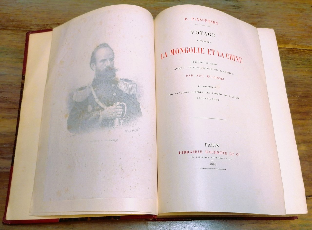 (Viaggiatori russi in Asia Centrale - Viaggi - Esplorazioni - Mongolia - Cina) Volume tradotto dal russo per questa prima edizione francese da Aug. Kuscinski. In 4°, legatura coeva firmata Charles Magnier in mezzo marocchino rosso con punte, dorso a 5 nervi con titoli ed impressioni in oro, ai piatti carta marmorizzata monocroma e filetti in oro, taglio di testa dorato, guardie in carta marmorizzata a pettine, pp. (2),563,(1), con ritratto di Piassetsky in antiporta, 90 incisioni nel testo, molte a piena pagina, tratte da disegni dell'autore ed una carta geografica fuori testo. Relazione della spedizione scientifica e commerciale in Cina diretta dal colonnello Yulian Sosnovsky ed allestita dal Governo Russo negli anni 1874 e 1875 a cui partecipò come naturalista il medico e pittore Pavel Pyasetsky. Ottimo stato di conservazione.