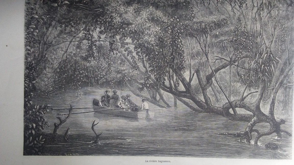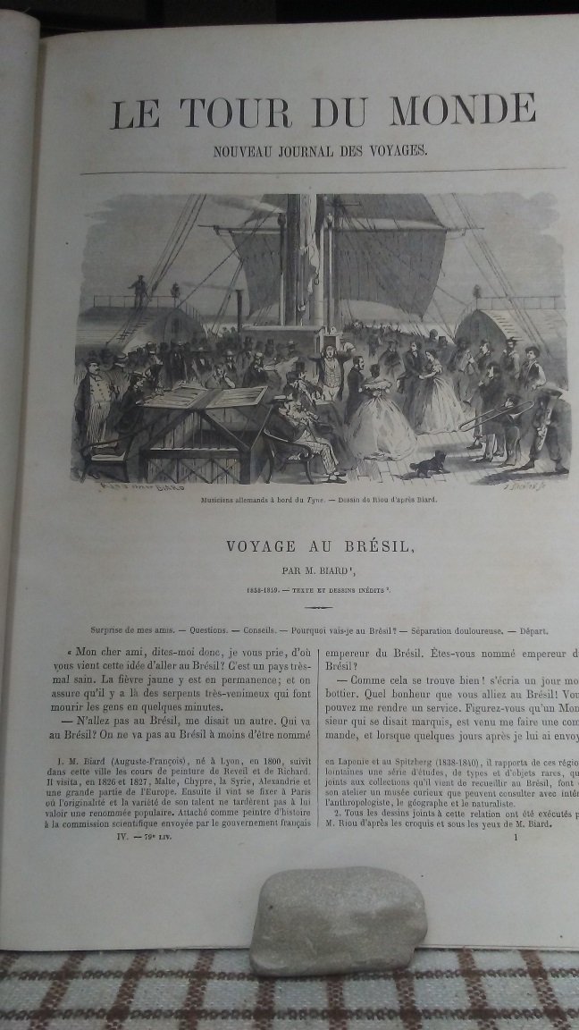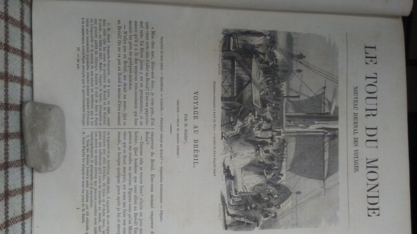 Fascicolio in 4, brossura muta, occhiello, frontespizio, 48 pp., 55 xilografie nt. Estratto dalla rivista settimanale 'Le tour du monde' edita a Parigi negli anni 1860 e seguenti, illustra il viaggio di Biard in Brasile con belle ed interessanti illustrazioni, alcune a piena pagina raffiguranti scene di vita quotidiana, usi e costumi, la flora e la fauna della foresta, ecc. In bello stato e poco comune.