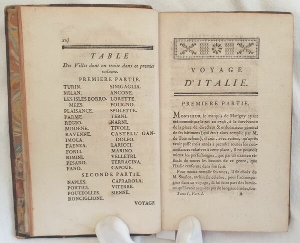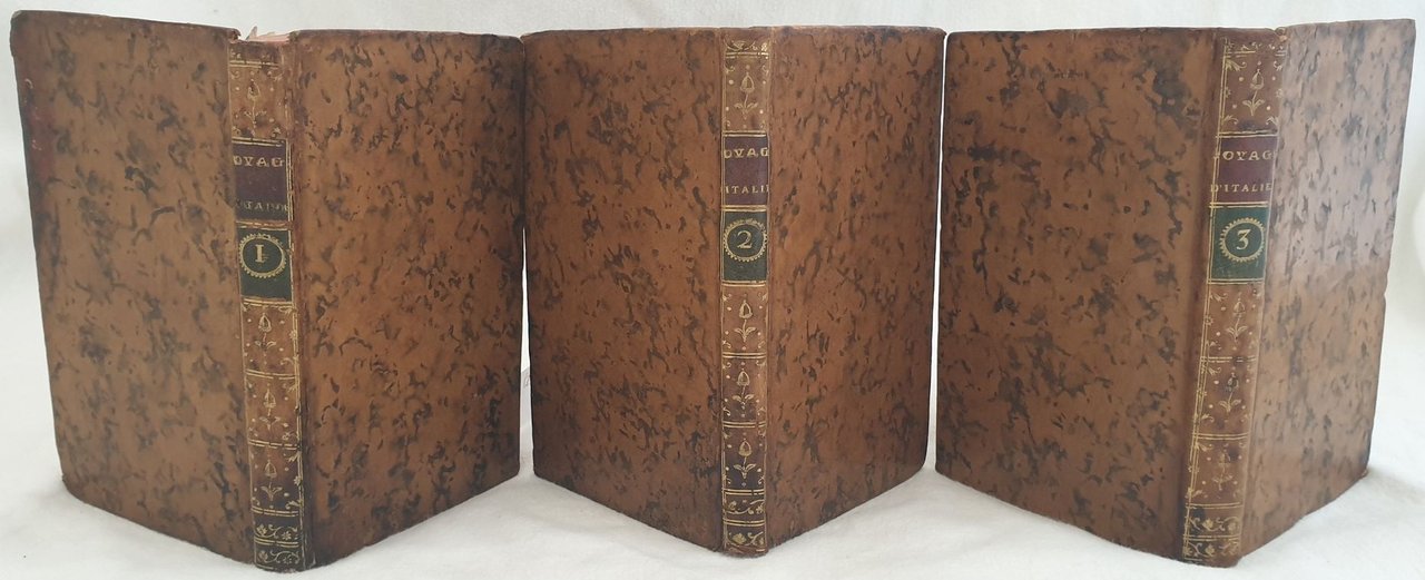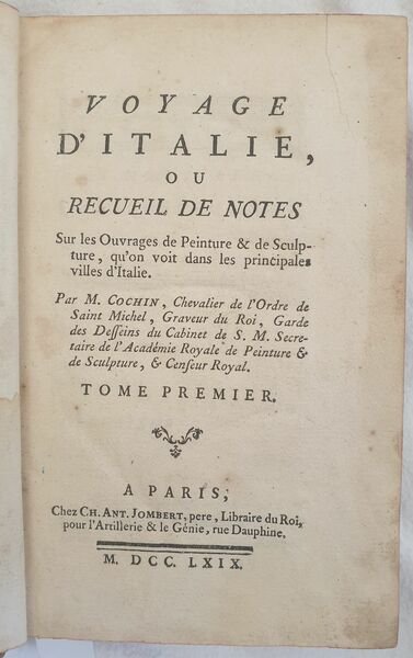 Edizione del 1769 di questa celebre opera di viaggio del critico e incisore francese Charles Nicolas Cochin (1715-1790). L'opera è il risultato delle osservazioni e note prese dall'artista durante il suo viaggio in Italia avvenuto nei due anni 1749-51 insieme al fratello di Madame de Pompadour, il futuro marchese di Marigny, di Soufflot e dell'Abate Le Blanc. L'itinerario descritto va da Torino a Napoli passando dalle Marche e offre qualche importante deviazione rispetto ai consueti itinerari. Esclusa dalla descrizione Roma per precisa scelta dell'autore. Tra le località descritte: Torino, Susa, Milano, Parma, Colorno, Reggio, Modena, Ravenna, Imola, Pesaro, Ancona, Loreto, Foligno, Terni, Narni, Tivoli, Castel Gandolfo, Marino, Terracina, Napoli, Portici, Pozzuoli, Ronciglione, Caprarola, Viterbo, Siena, Firenze, Lucca, Pisa, Livorno, Bologna, Ferrara, Venezia, Padova, Vicenza Verona, Mantova, Cremona, Brescia, Bergamo, Genova ecc. L'opera è composta da tre tomi ed è completa. In buone condizioni. Copertina in piena pelle coeva con titolo e decorazioni in oro al dorso in buone condizioni generali con lievi usure ai margini e dorso. Legatura in buone condizioni. All'interno le pagine si presentano in buone condizioni con fioriture. In 16. Dim. 17,5x11,5 cm. Pp. XVI+230, 197, 288. Peso Kg. 0,650.Edition of 1769 of this famosu work of travel by the french critic and engraver Charles Nicolas Cochin (1715-1790). The work is the result of observations and notes of the artist during his travel in Italy during the two years 1749-51 together with the brother of Madame de Pompadour, the future Marquise Marigny, di Soufflot Abate Le Blanc. The route described goes from Turin to Naples passing through Marche and describes some important bdeviation if compared to normal travels. Rome is excluded from description. The towns described: Torino, Susa, Milano, Parma, Colorno, Reggio, Modena, Ravenna, Imola, Pesaro, Ancona, Loreto, Foligno, Terni, Narni, Tivoli, Castel Gandolfo, Marino, Terracina, Napoli, Portici, Pozzuoli, Ronciglione, Caprarola, Viterbo, Siena, Firenze, Lucca, Pisa, Livorno, Bologna, Ferrara, Venezia, Padova, Vicenza Verona, Mantova, Cremona, Brescia, Bergamo, Genova ecc. The work is made up of three tomes and it is complete. In good conditions. Full leather coeval cover with gilted title and decorations in the spine in good general conditions lightly worn in the extremities. Binding in good conditions. Inside pages are in good conditions with foxing. In 16. Dim. 17,5x11,5 cm. Pp. XVI+230, 197, 288. Weight Kg. 0,650.