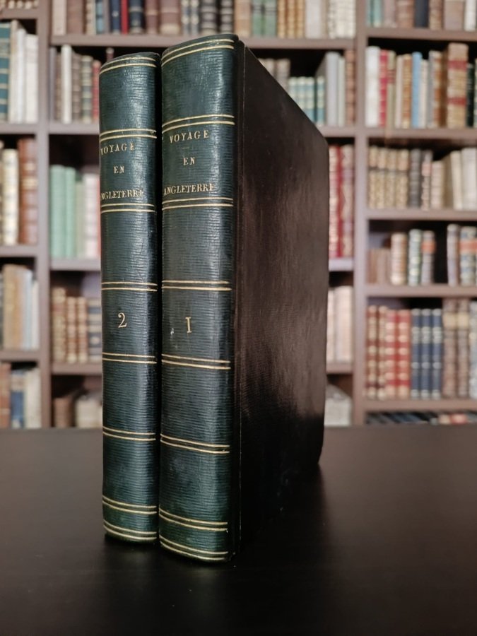 2 volumi in-8° (cm. 19,3), legature coeve in mezza pelle verde con titolo e filetti in oro ai dorsi; pp. . XI 525, 450 in ottimo stato (leggerissima brunitura uniforme); con 13 vignette nel testo, 15 tavole fuori testo (13 delle quali in seppia all'acquatinta protette da velina eseguite da Tiringer su disegni dell'autore) e 2 tabelle ripiegate sempre fuori testo. Prima edizione in Francese che segue un'edizione in inglese dell'anno precedente. L'autore lasciò la Francia durante il periodo della Rivoluzione e trascorse vent'anni in America prima di recarsi in Inghilterra. Il suo resoconto del soggiorno inglese comprende commenti sulla Royal Institution, l'arte e l'antiquariato, la libertà di stampa, le aste, il teatro, il diritto penale, la svalutazione della moneta, le leggi sui poveri, Dugald Stewart, la teoria huttoniana, la manifattura, la Bodleian Library, le miniere, l'agricoltura, la prigione di Newgate. Cfr. Querard IX, 169. Ottimo esemplare. (NQ3)