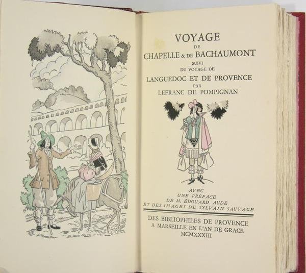 Des Bibliophiles de Provence, Marseille, 1933. 5 f. 133 pages, in/8 oblong reliure en demi-maroquin rouge, dos lisse à fleuron et titre dorés, demi-plat en papier velours rouge, couvertures et dos conservées, illustrations en couleur de Sylvain Sauvage. Exemplaire numéroté nominatif. Édition numéroté CI / CXX, 1 des 100 exemplaires H.C. Félix Roy, dit Sylvain Sauvage est un illustrateur et technicien du livre français. Il a été exposant du Salon des artistes décorateurs et directeur de l'École Estienne. Il a illustré de nombreux ouvrages. Il a épousé en premières noces, l'illustratrice de mode Charlotte Grappe-Roy