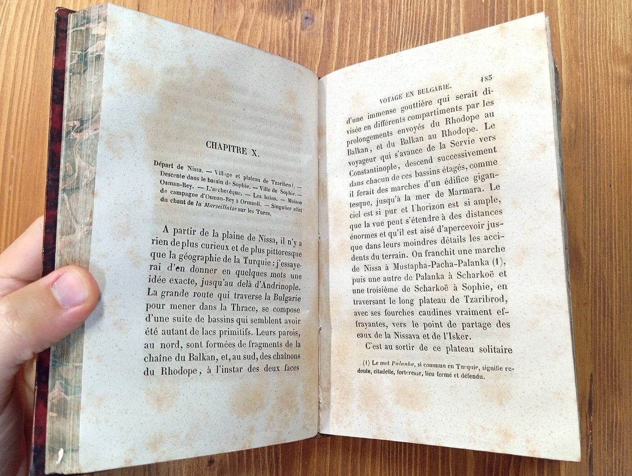 Prima e unica edizione originale - Volume rilegato in mezza pelle amatoriale con titolo e cornici in oro al dorso, sguardie e tagli marmorizzati, x-414 pagine; testo in lingua francese. Diffuse fioriture alle carte, ma paginazione sempre ben leggibile e compatta; nel complesso buon esemplare -- Famoso economista, Adolphe Blanqui (1798-1854) visitò la Bulgaria su richiesta del Ministro degli Affari Esteri François Guizot, che voleva informarsi sullo stato del Paese, dove una parte della popolazione cristiana si era appena sollevata contro i turchi. Dopo essere passato per Strasburgo, Monaco e Vienna, arrivò a Belgrado e attraversò la Turchia europea, visitando Vidin, Belgrachick, Nissa, Tzaribrod, Ittiman, Yenichen o Novozelo, Pazardjik, Philippopolis, Ousounjova, Andrinople, Khafsa, Eski-Baba, Tchorlou, Silivri e Costantinopoli. Sulla via del ritorno, passò per l'arcipelago greco, Malta, Napoli, sbarcò a Marsiglia e tornò a Parigi. Il suo resoconto contiene molti dettagli sui Paesi visitati: costumi, religione, monumenti, ecc. e un resoconto delle cause della rivolta bulgara del 1841.