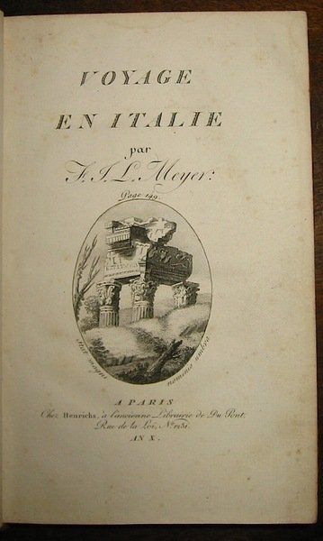 8vo (cm. 19,4), XIV-426 pp. Graziosa vignetta incisa su rame al frontis. Legatura coeva in piena pelle con ricchi fregi e titolo oro su tassello rosso al ds. (lievi segni d’uso e minuscola mancanza al piatto posteriore). Cornici dorate ai piatti. Tagli e carte di guardia marmorizzate in modo uniforme. Bell’esemplare. Edizione originale della traduzione di Ch. Vanderbourg dal tedesco ‘Darstellungen aus Italien’ del 1792. Fossati-Bellani, 427.