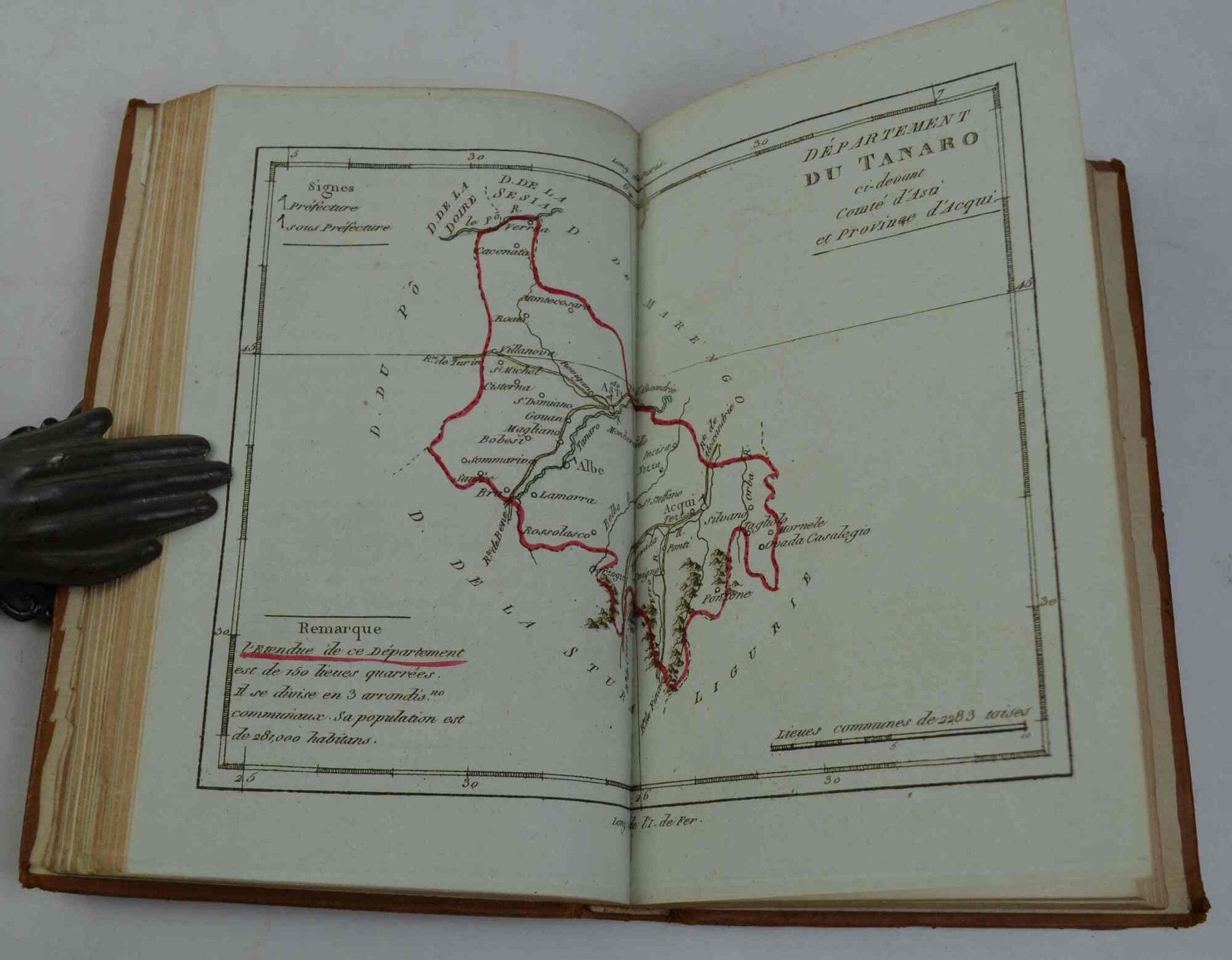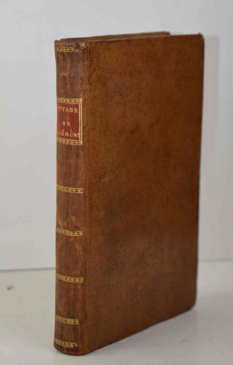 Cm. 19,5, pp. (2) vii (1) 247 (1). Con 15 tavole f.t. di cui 6 carte su doppia pagina in fine acquerellatura coeva e stampate su carta azzurra, raffiguranti i dipartimenti della Dora, della Sesia, di Marengo, del Tanaro, del Po, della Stura, e 7 (di 8!) tavole f.t. Legatura coeva in piena pella, dorso liscio con titoli e fregi in oro. Esemplare genuino e ben conservato, privo (dall'origine?) della tavola raffigurante l'abbazia di S. Michele. Timbro (di società alpinistica?) al frontespizio. Edizione originale di quest'importante descrizione del primo '800 di viaggio in Piemonte. Cfr. Lozzi (II, 3610).