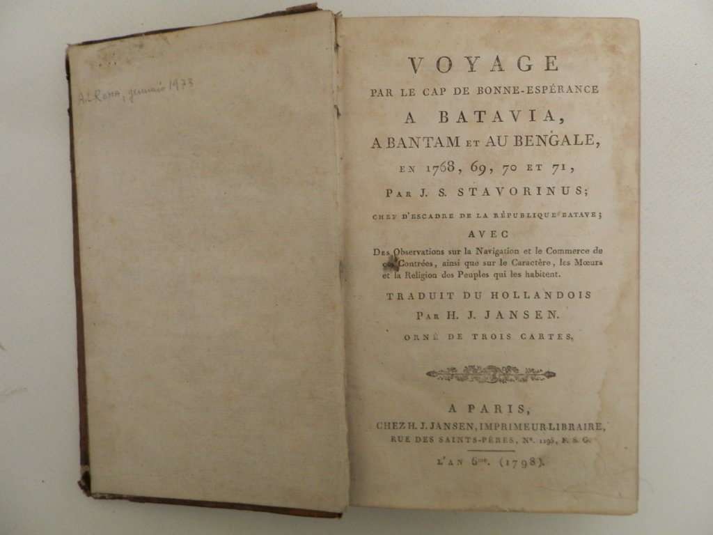 Voyage par le Cap de Bonne-Espérance a Batavia, a Bantam et au Bengale, en 1768, 69, 70, 71, par J. S. Stavorinus: chef d’escadre de la république batave; avec des Observations sur la Navigation et le commerce de ces Contrées, ainsi que sur le Caractère, les Moeurs et la Religion des Peuples qui les habitent. Traduit du hollandois par H. J. Jansen. Orné de trois cartes.