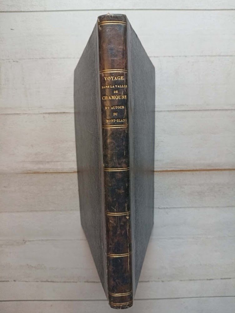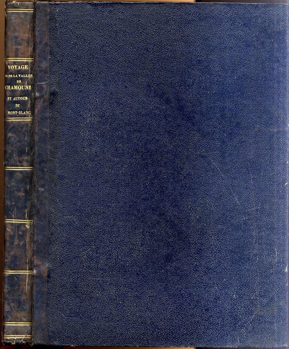 >in-4 (mm.300x230), (2 ff., occhietto e titolo), pp. (90) di testo descrittivo intervallato dalle tavole protette da velina, in fine la Table des planches; 40 tavole fuori testo incise all'acquatinta e stupendamente dipinte a mano, inventate da Lory padre e figlio (varie), Coignet, Mauron, Ostervald, Leprince, ed incise da Bennet, Falkesein, Reeve, Salathé, Soilié e Fielding, cioè dai migliori artisti francesi di paesaggio del primo Ottocento. Legatura coeva in m. pelle blu e angoli, titolo e fregi oro al dorso, piatti in percallina blu. Questo viaggio, certamente assai più importante per l'iconografia alpina piuttosto che per il testo di Raoul-Rochette (1790-1854, professore di chiara fama all'università di Parigi), costituisce la prima completa descrizione per immagini del classico giro attorno al Monte Bianco, che, nella serie di luminose vedute è raffigurato dalla valle di Sallenche, da Chamonix, dalla valle di Courmayeur.
