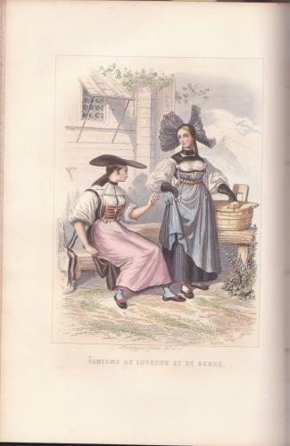 in 8°, pp. VIII, 560; legatura coeva m/pelle nera con tit. e fregi in oro al ds., tagli spruzz., piatti in tela grigia sguardie marmor. con 24 incisioni f.t. dei fratelli Rouargue, protette da veline, di cui 8 colorate a mano coi costumi tradizionali dei cantoni svizzeri; piccoli fregi tip. Strappo riparato ad una delle tavv., piccole sbucc. alla leg. ma buon esemplare 466/36