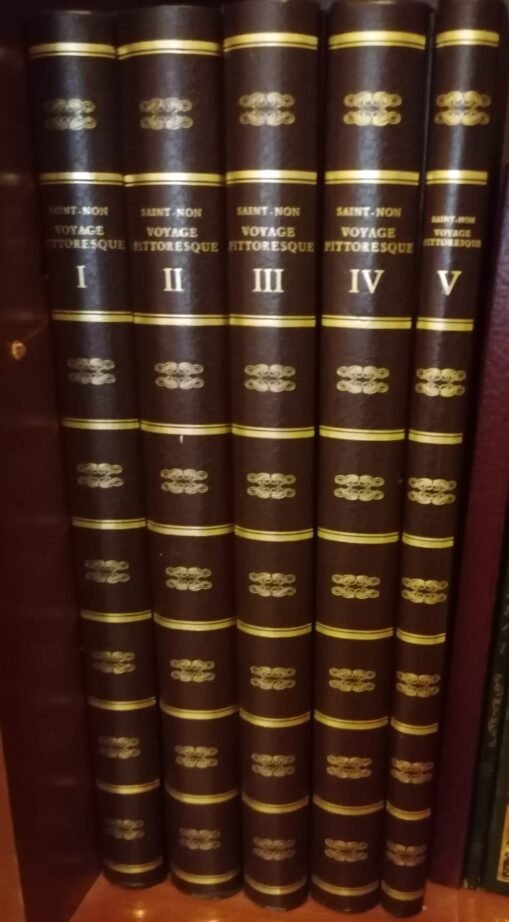 5 volumi in folio, pp. XIII+252; XXVIII+248; XL+201+22; XVIII+266; IV da 267 a 429 con 8 carte geografiche a doppia pagina e 284 tavv. f.t. Per complessive 417 vedute, corredate da didascalia, alcune ill. a colori nel t., splendide vignette ai frontespizi, artistiche testatine, finalini e motivi ornamentali, note a pie di pagina e marginali. Bella legatura in mz. pelle con angoli, tit. e ricchi fregi in oro ai dorsi, piatti marmorizzati. Pregevolissima e rarissima edizione ristampata in fac-simile, a due secoli dalla prima edizione, in 500 esemplari numerati su carta speciale delle Cartiere Italiane Riunite. Uno dei classici della letteratura di viaggio settecentesca in una preziosa edizione anastatica.