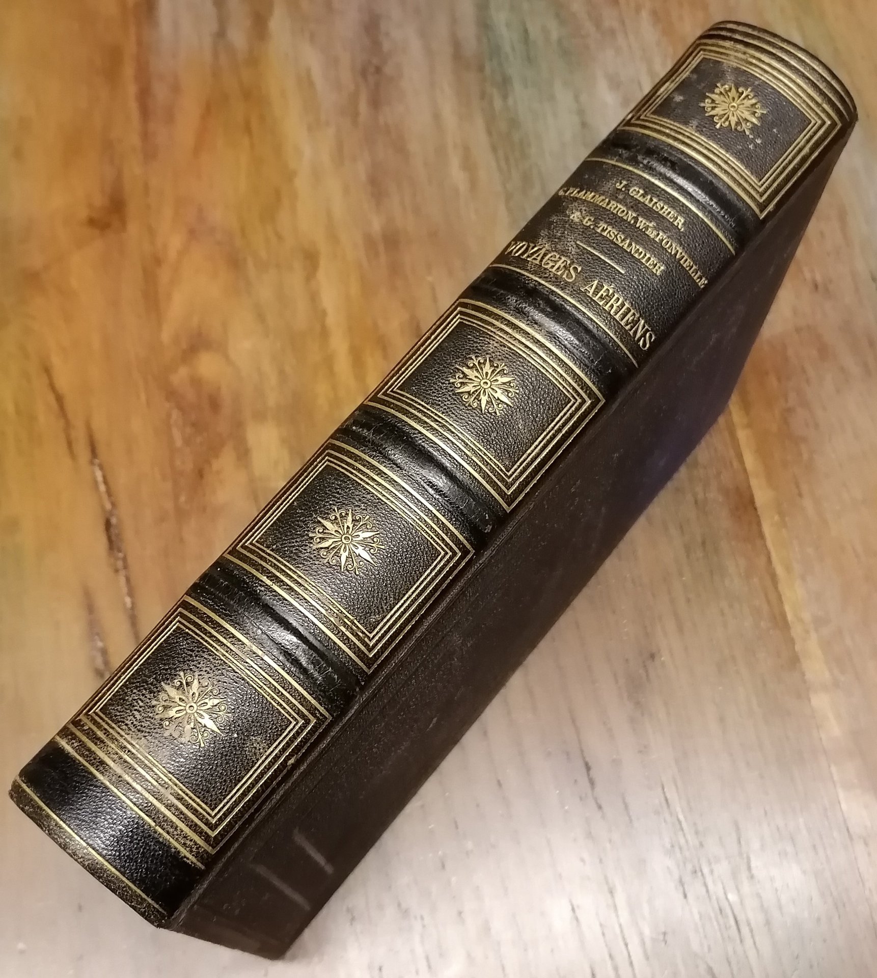 (Viaggi - Aeronautica - Mongolfiere - Palloni aerostatici) In 8°, legatura coeva in mezza pelle testa di moro, al dorso 4 falsi nervi e titoli con fregi impressi in oro, piatti in percallina verde scuro con cornici a secco, tagli dorati, guardie in carta tipo serpente color bianco, pp. (10),612, frontespizio in rosso e nero, 117 illustrazioni nel testo, anche a piena pagina, tra cui il ritratto di James Glaisher in antiporta, 6 tavole in cromolitografia protette da veline, 15 diagrammi e carte fuori testo. Una dedica (1902) al recto della prima carta bianca. Prima edizione. Volume solido e ben conservato.
