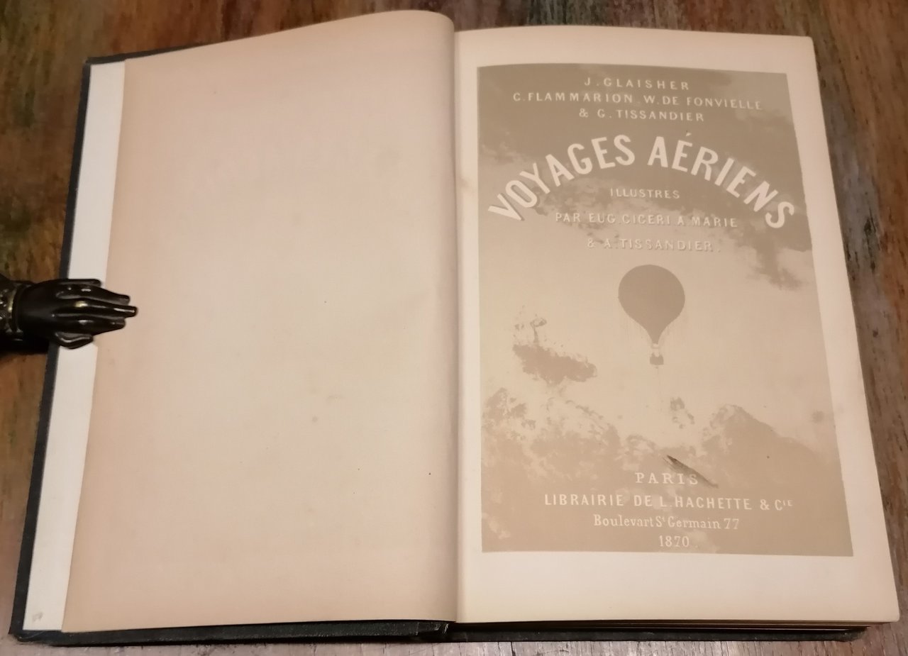 Voyages aériens. Ouvrage contenant 117 gravure sur bois et 6 chromolithographies dessinèes d'apres les croquis d'Albert Tissandier par Eugène Cicéri et Adrien Marie et 15 diagrammes ou cartes.