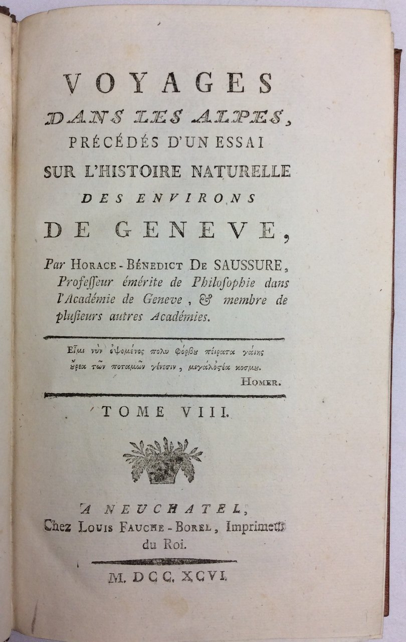 In-16 gr. (mm. 195x122), 8 volumi, mz. pelle coeva, dorso a cordoni con fregi e titolo oro (uno con piccola manc.), piatti in tela (con aloni), tagli azzurri, pp. (4),423; (4),411; (4),456; (4),474; (4),XVI,496; (4),368,(4); (4),528,(4); (4),445. "Mancano tutte le tavole" e il Discours préliminaire al 1° volume. Celebre e fortunata opera, ricca di osservazioni ed esperienze scientifiche, geologiche, mineralogiche ed alpinistiche, particolarmente relative al Monte Bianco, della cui conquista ed esplorazione il de Saussure fu l'animatore. Affascinante è la descrizione del classico giro del Bianco. L'originalità dell'opera consiste nell'alternarsi di notizie rigorosamente scientifiche, con gustose annotazioni di costume e vivaci appunti personali. Cfr. Graesse,VI,277 - Brunet,V,151.Nel ns. esemplare i primi 4 volumi portano la data 1803 e gli ultimi 4 la data 1796. Ben conservato.