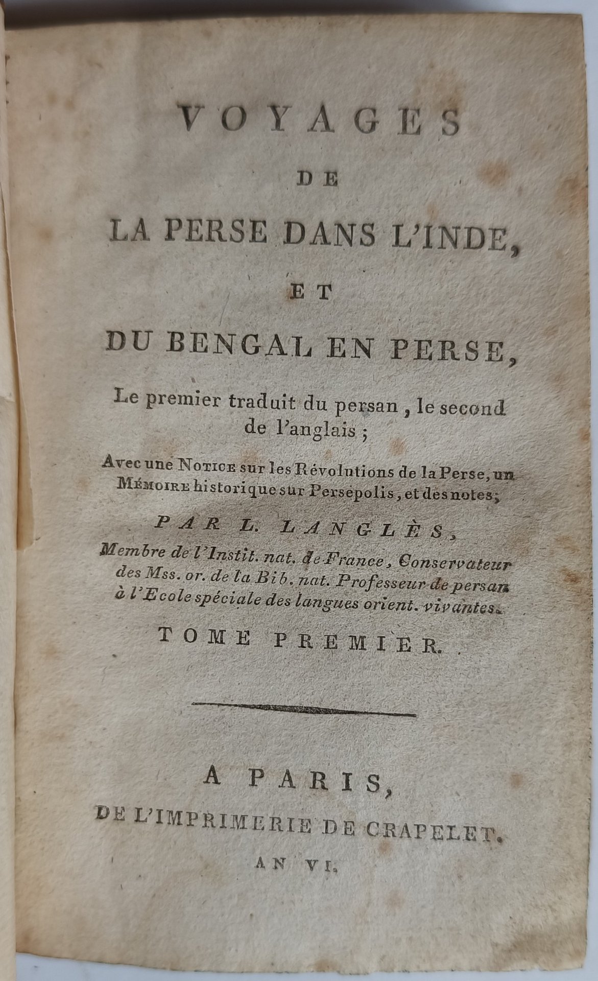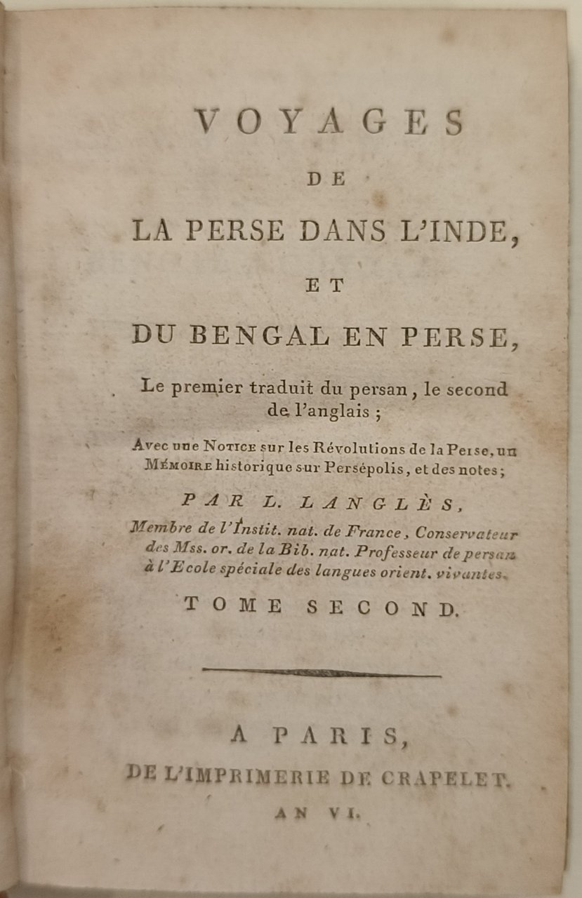 Voyages de la Perse dans l'Inde, et du Bengal en Perse, Le premier traduit du persan, le second de l anglais ; Avec une Notice sur les Révolutions de la Perse, un Mémoire historique sur Persépolis, et des notes ; Par langlès, Membre de l'Inst. Nat. De France, Conservateur de Mss. or. de la Bib. nat. Professeur de la persan à l'Ecole spéciale des langues orient. vivantes. A Paris, de l'imprimerie de crapelet. An VI. In 2 volumi. vol. 1 pp CXXXI 142; vol. 2 pp. (4) 270.