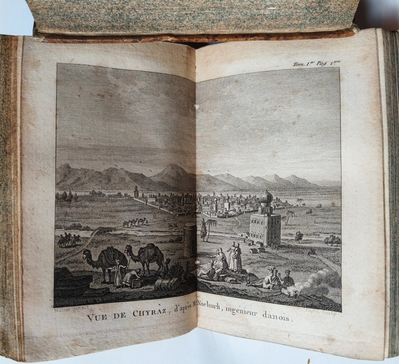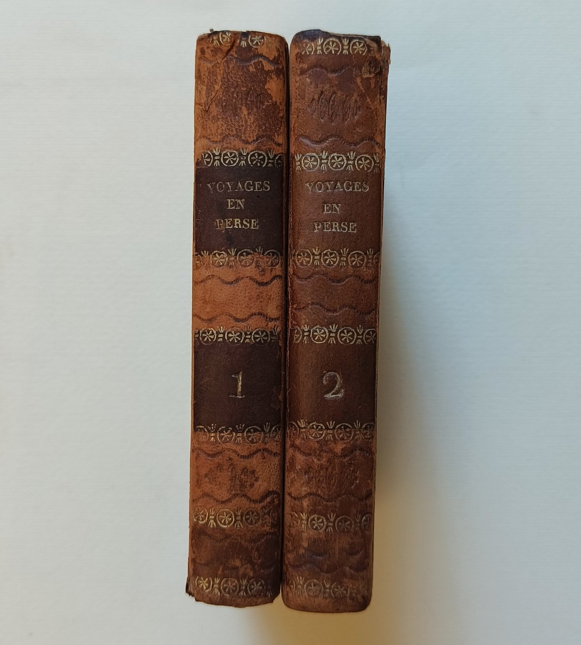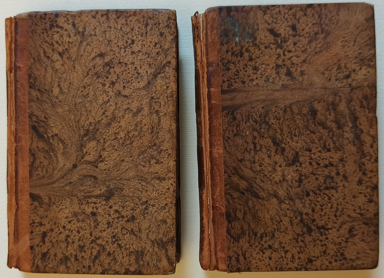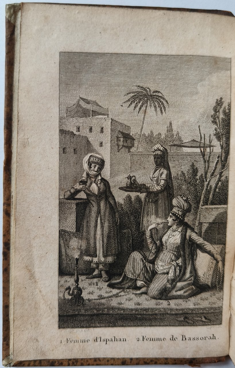 Cm 12,8. Rilegatura in mezza pelle, piatti marmorizzati. Dorso decorato con fregi, titolo e numero del volume in oro. Tagli spruzzati in azzurro. I volumi sono completi delle quattro incisioni, due di costumi e due sviluppati che offrono la vista di Shiraz e della tomba del poeta persiano Hhâfiz. Timbro di appartenenza Ing. Ferninando Cassinis sulla pagina di guardia. Minime mancanze al dorso. Qualche macchia di umidità sparsa alle carte.