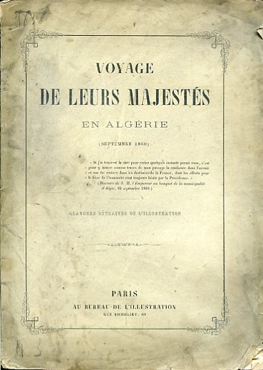 In-4°, pp. 46, brossura editoriale con titolo entro filetto con fregi accantonati. Vignetta xilografica al piatto di tergo. Illustrazioni xilografiche f.t., anche ripiegate o su doppia pagina, tratte da 'L'Illustration', raffiguranti paesaggi, tipi umani e costumi algerini e la visita di Napoleone III e dell'Imperatrice Eugenia in Algeria; le incisioni sono da invenzione di Steyer, Raoult, Letuaire, Crapelet, Galetti, Janet-Lange, Blanchard, Worms, Godefroy Durand, Grandsire, Rouargue, Anasti, Provost, Gaildreau, Best, Fessart. Ombre alla brossura. Discreto esemplare in barbe. Anonimo resoconto dei tre giorni di viaggio di Napoleone III e della consorte nella colonia francese, con descrizione delle feste organizzate ad Algeri, degli archi di trionfo eretti per l'occasione, dei banchetti che furono indetti e dei discorsi che furono pronunziati dalle autorità locali. Contemporaneamente venne stampata dell'opera una più ampia edizione in-4° grande.