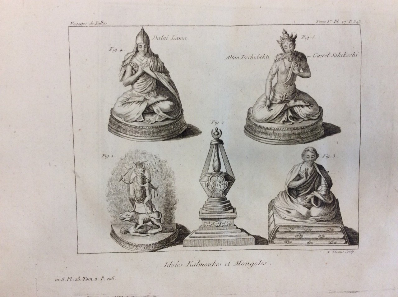 In-8 p. (mm. 202x123), 8 volumi di testo + Atlante in-4 p. (mm. 319x242), rilegati in piena pelle coeva (alc. lievi mancanze), decoraz. e titolo oro su due tasselli al dorso, tagli marmorizzati (i volumi di testo) e tagli dorati (l'Atlante), dentelles dorate ai risguardi, pp. XL,422; (4),490; (4),492; (4),499; 448; 455; 448; (4),VIII,463. Il volume 8° - Appendix - contiene les descriptions des Animaux et des Végétaux observés dans les voyages du Professeur Pallas, et cités ou mentionnés dans les volumes précédens; Avec des notes et observations par le C. Lamarck, Professeur de Zoologie au Muséum national d'Histoire naturelle. L'Atlante raccoglie 107 (su 108) belle tavole inc. in rame, di cui: 1 grande carta divisa in due fogli più volte ripieg. de l'Empire de Russie, d'après la nouvelle division de cet Empire en quarante-deux Gouvernemens // 10 carte geografiche (di cui 6 più volte ripieg.) // 1 veduta de la Residence d'Ablaikit (ripieg.) // 11 tavole di costumi e idoli // 8 tavole (di cui 1 ripieg.) di antichi monumenti, geroglifici, etc. // 9 tavole di animali, storia naturale, etc., // 67 (su 68) tavole di botanica (di cui 22 ripieg.). "Manca la tav. 74". Seconda edizione della traduzione francese di questo resoconto di viaggi condotti per tutto l'Impero Russo (il primo nel 1769-1774, il secondo nel 1793-1794) da Simon Peter Pallas, professore dell'Accademia di Scienze di San Pietroburgo e amico della zarina Caterina II. Cfr. Brunet,IV,325 - Graesse,V,109.Peter Simon Pallas (1741-1811), naturalista tedesco. Lavorò per qualche anno nei musei di Olanda e Inghilterra, poi fu chiamato dalla Russia a prender parte ad una spedizione. Fu uno dei più eminenti esploratori del sec. XVIII, e le collezioni zoologiche, geologiche, botaniche, archeologiche ed etnologiche che raccolse durante le sue spedizioni furono di notevolissima importanza. la sua opera fornisce una massa enorme di osservazioni isolate sui modi di sussistenza delle popolazioni, sulle miniere, sulla caccia e la pesca, sulle formazioni steppose (primo tentativo di suddivisione della Russia in provincie botaniche), sulle terre nere (da lui così battezzate), sul clima (specialmente del basso Volga), sulla formazione delle montagne (osservazioni sui graniti in rapporto alle eruzioni), sul terreno gelato della Siberia. A lui si deve pure una serie di ricerche sull'antica unione del Mar Nero, Caspio e Aral, di cui è data per la prima volta una spiegazione plausibile (cfr. Enciclopedia Treccani,XXVI, p. 122). Solo qualche rara e lieviss. fioritura, altrimenti esemplare ben conservato.