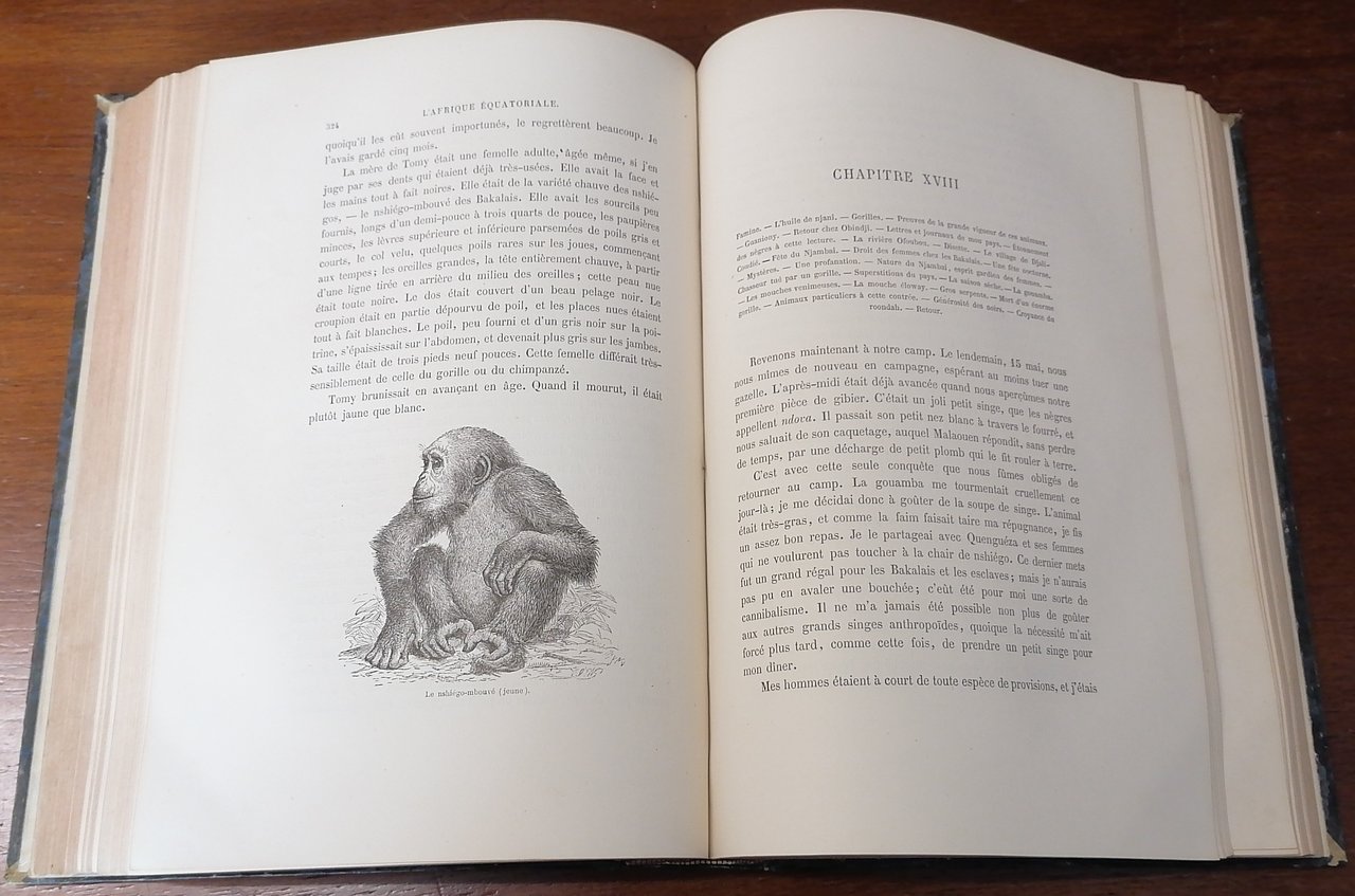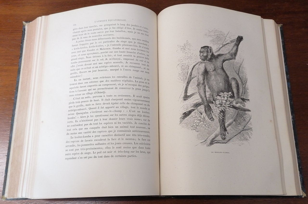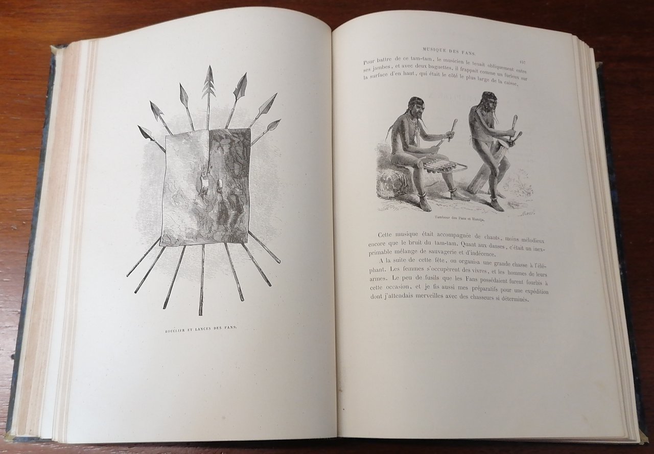 (Africa Equatoriale; Viaggi; Gabon; Esplorazioni) In 8° grande, legatura coeva in mezza pelle verde scuro, dorso a 4 nervi con titolo e filetti impressi in oro, carta marmorizzata ai piatti, pp. (4),VIII,546,(2), con numerose incisioni in legno nel testo, 27 tavole fuori testo, una carta geografica ripiegata alla fine del volume. Paul Belloni du Chaillu, viaggiatore e scienziato franco-americano, esplorò il Gabon dal 1855 al 1859 svolgendo rilevazioni geologiche e naturalistiche su incarico della Philadelphia Academy of Natural Sciences e della Boston Society of Natural History. A lui si devono importanti informazioni etnologiche e di storia naturale, in particolare le descrizioni dei grandi primati africani, fu il primo uomo bianco ad incontrare la popolazione dei pigmei nella foresta occidentale del Gabon ed a catturare un'esemplare di gorilla di pianura. Prima edizione francese riveduta ed aumentata rispetto all'edizione originale in lingua inglese del 1861. Ottimo stato di conservazione.