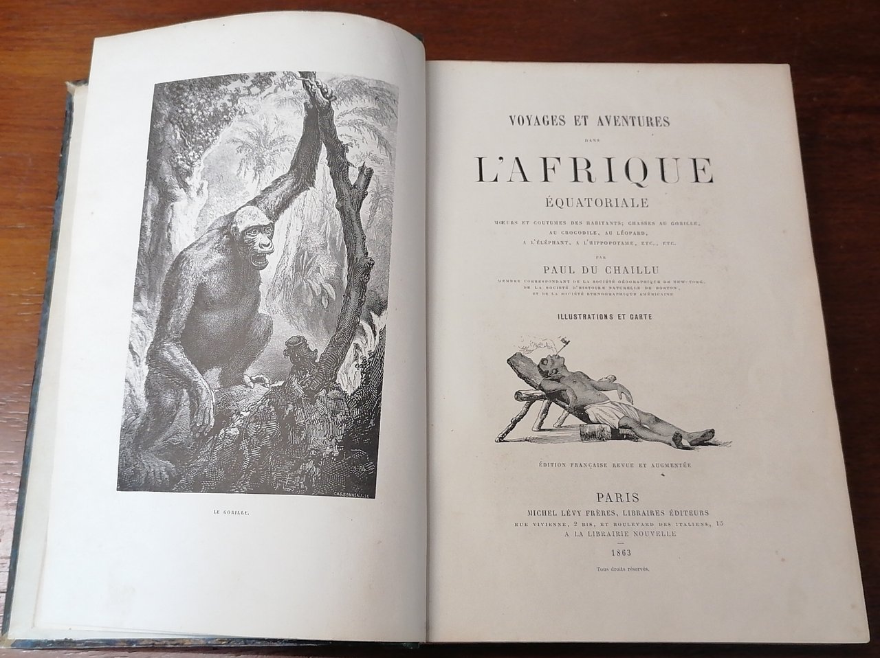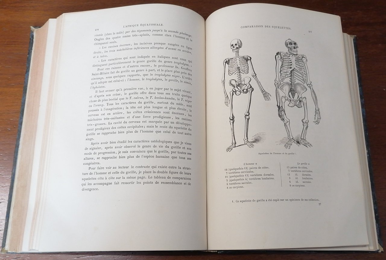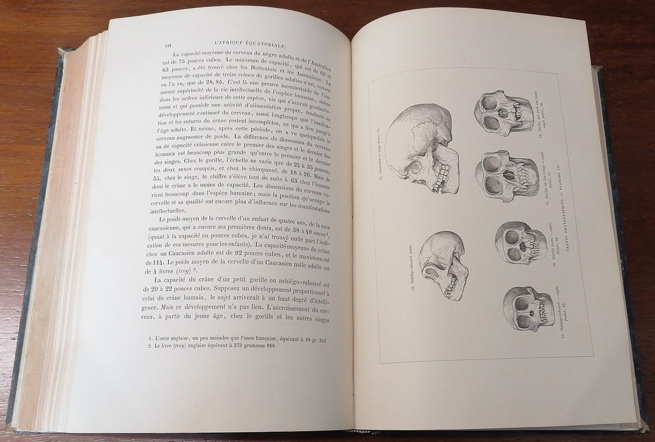 (Africa Equatoriale; Viaggi; Gabon; Esplorazioni) In 8° grande, legatura coeva in mezza pelle verde scuro, dorso a 4 nervi con titolo e filetti impressi in oro, carta marmorizzata ai piatti, pp. (4),VIII,546,(2), con numerose incisioni in legno nel testo, 27 tavole fuori testo, una carta geografica ripiegata alla fine del volume. Paul Belloni du Chaillu, viaggiatore e scienziato franco-americano, esplorò il Gabon dal 1855 al 1859 svolgendo rilevazioni geologiche e naturalistiche su incarico della Philadelphia Academy of Natural Sciences e della Boston Society of Natural History. A lui si devono importanti informazioni etnologiche e di storia naturale, in particolare le descrizioni dei grandi primati africani, fu il primo uomo bianco ad incontrare la popolazione dei pigmei nella foresta occidentale del Gabon ed a catturare un'esemplare di gorilla di pianura. Prima edizione francese riveduta ed aumentata rispetto all'edizione originale in lingua inglese del 1861. Ottimo stato di conservazione.