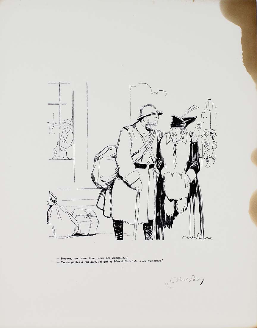 Abel Jules Faivre (Lione 1867 - Nizza 1945) Litografia originale firmata a mano dall'artista.Dimensioni: 56 x 38,5 cmCon certificato di autenticità C.O.A.Ingiallimento laterale come da foto.Esemplare numero 62/250 La raccolta di litografie umoristiche del caricaturista francese Abel Faivre (Lione 1867-Nizza 1945), andata a confluire nel volume Jours de guerre,fu pubblicata in due tomi tra il 1915 e il 1919. Con il procedere del conflitto, l'opinione pubblica di tutti i paesi coinvolti,che aveva dapprima affrontato tale evento con ottimismo, mutò rapidamente opinione sino a considerare la guerra, senza mezzi termini,come un avvenimento rovinoso. In tale contesto, le vignette satiriche di guerra possedevano un potente effetto catartico,adempivano un ruolo sociale irrinunciabile, fornendo una valvola di sfogo all’incombere dal più cupo pessimismo. Abel Jules Faivre (Lyon 1867 - Nizza 1945) Originale Lithographie vom Künstler von Hand signiert.Abmessungen: 56 x 38,5 cmMit Echtheitszertifikat C.O.A.Seitliche Vergilbung wie auf dem Foto.Kopieren Sie die Nummer 62/250 Die Sammlung humorvoller Lithographien des französischen Karikaturisten Abel Faivre (Lyon 1867-Nizza 1945), die in den Band Jours de guerre floss,es wurde zwischen 1915 und 1919 in zwei Bänden veröffentlicht. Im Verlauf des Konflikts wurde die öffentliche Meinung in allen beteiligten LändernWer dieses Ereignis anfangs mit Optimismus konfrontiert hatte, änderte schnell seine Meinung, um den Krieg ohne Zweifel zu betrachten.wie ein ruinöses Ereignis. In diesem Zusammenhang hatten die satirischen Kriegskarikaturen eine starke kathartische Wirkung.Sie erfüllten eine unverzichtbare soziale Rolle und bildeten ein Entlastungsventil gegen den dunkelsten Pessimismus. Abel Jules Faivre (Lyon 1867 - Nice 1945) Lithographie originale signée à la main par l'artiste.Dimensions: 56 x 38,5 cmAvec certificat d'authenticité C.O.A.Jaunissement latéral comme sur la photo.Copie numéro 62/250 La collection de lithographies humoristiques du caricaturiste français Abel Faivre (Lyon 1867-Nice 1945), qui allait se fondre dans le volume Jours de guerre,il a été publié en deux volumes entre 1915 et 1919. À mesure que le conflit progressait, l'opinion publique de tous les pays impliqués,qui avait d'abord fait face à cet événement avec optimisme, a rapidement changé d'avis pour envisager la guerre, en termes non équivoques,comme un événement ruineux. Dans ce contexte, les caricatures de guerre satiriques ont eu un puissant effet cathartique,ils remplissaient un rôle social indispensable, fournissant une soupape de décharge du pessimisme le plus sombre. Abel Jules Faivre (Lyon 1867 - Nice 1945) Original lithograph signed by hand by the artist.Dimensions: 56 x 38.5 cmWith certificate of authenticity C.O.A.Lateral yellowing as in the photo.Copy number 62/250 The collection of humorous lithographs by the French caricaturist Abel Faivre (Lyon 1867-Nice 1945), which went to flow into the volume Jours de guerre,it was published in two volumes between 1915 and 1919. As the conflict progressed, public opinion in all the countries involved,who had initially faced this event with optimism, quickly changed his opinion to consider the war, in no uncertain terms,like a ruinous event. In this context, the satirical war cartoons had a powerful cathartic effect,they fulfilled an indispensable social role, providing a relief valve from the darkest pessimism.