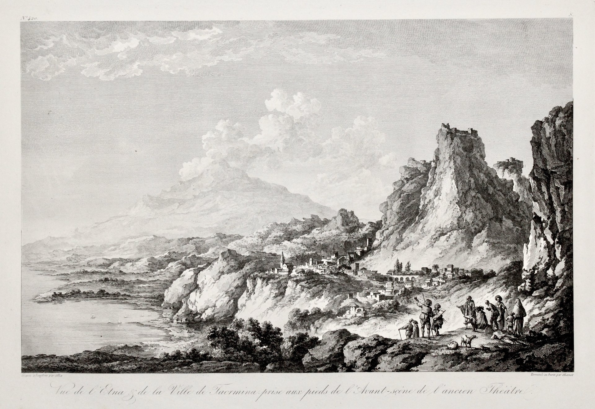 Incisione eseguita in rame all'acquaforte da Allix e terminata a bulino da Aliamet. Mm 390x250 circa. Tratta dall'edizione ottocentesca di "Voyage Pittoresque ou description des Royaumes de Naples et de Sicile", in assoluto una delle più belle ed eleganti opere descrittive del regno di Napoli: composta da cinque volumi usciti dal 1781 al 1786, rappresentò un enorme sforzo economico e tipografico, ripagato peraltro da un successo enorme di vendite, diventando il modello tipografico su cui si basarono molte posteriori opere di viaggio. Ottimo esemplare con ampi margini.