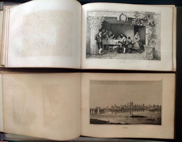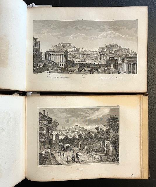 Audot, 1830 circa (senza altre indicazioni tipografiche). Due volumi in 8vo oblungo composti di sole tavole, incise dai più valenti intagliatori di vedutismo dell'epoca, tra questi l' Audot, i fratelli Rouargue, l'Aubert e il Durau. Il vol. I contiene circa 116 vedute (Milano, Como, Pavia, Brescia Cremona, Verona, Venezia, Parma, Genova, Bologna, Livorno, Pisa, Capri, Taranto, Messina, Catania, Palermo e loro contorni, con alcune scene di costumi e tradizioni; ci sono vedute anche di altre città); il vol. 2 contiene circa 116 vedute (Roma e Napoli e loro contorni, con alcune scene di costumi e tradizioni). La numerazione di entrambi i volumi è discontinua ma si tratta in totale di circa 232 tavole. Legature con piatti in cartonato telato e dorso con titoli e nervi oro, contropiatti e fogli di guardia in carta marmorizz. marrone. Normali segni alla legatura, buone le tavole.