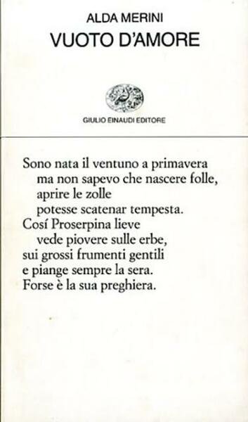 2. rist. X, 135 p. ; 18 x 10 cm. Collezione di poesia, 224. La Merini scrive in momenti di una sua speciale lucidità benché i fantasmi che recitano da protagonisti nel teatro della mente provengano spesso da luoghi frequentati durante la follia. In altre parole, vi è una prima realtà tragica vissuta in modo allucinato e in cui lei è vinta; poi la stessa realtà irrompe nell’universo della memoria e viene proiettata in una visione poetica in cui è lei con la penna in mano a vincere. Brossura editoriale, coperta in cartoncino flessibile plastificato opaco, titolo impresso in nero al piatto e al dorso. Segni del tempo ai rivolti della coperta e alle pagine interne (fioriture e ingiallimento della carta), per il resto libro integro. Codice libreria 7989.