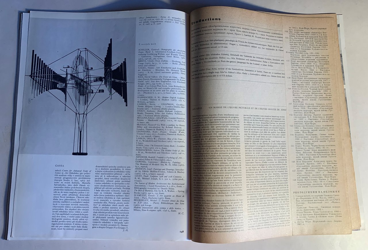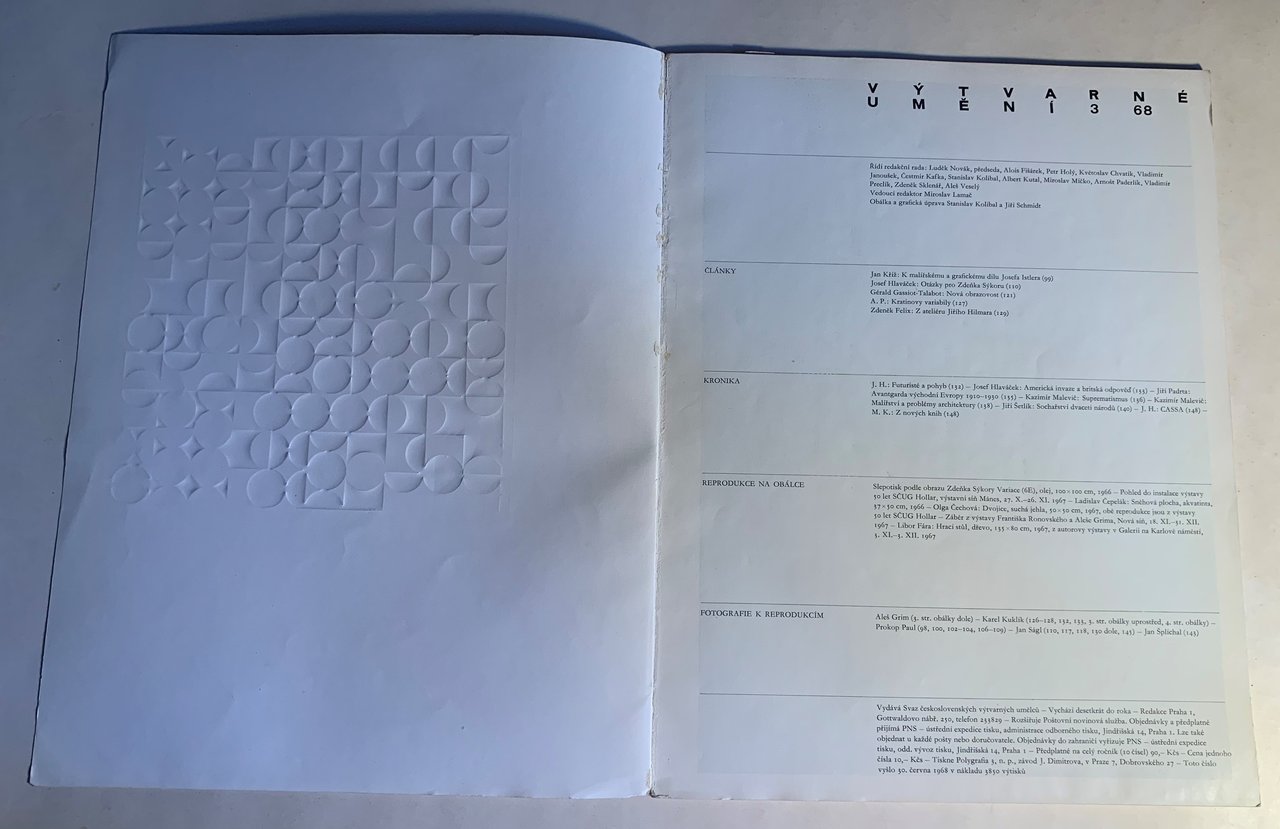 I ed.. N. 3 68 del periodico dell'Unione degli artisti cecoslovacchi (Svaz českých výtvarných umělců). Redazione e amministrazione: Praga, Gottwaldovo nábřeží 250. Testo in ceco con traduzioni in russo, francese, tedesco e inglese. IV/ 97-148+(10) ripiegate in carta leggera con traduzioni in russo, francese, tedesco e inglese=62/ brossura in cartoncino patinato bianco con grafica in nero e rosso e con illustrazione a rilievo al primo piatto e in b/n nei restanti piatti. Illustrazioni in b/n nel testo e f.t. e a colori f.t.. Obálka a grafická/ Copertina e grafica Stanislav Kolíbal a/ e Jiří Schmidt. Stato buono (usura della copertina - copertina brunita e polverosa - pagine lievemente brunite).